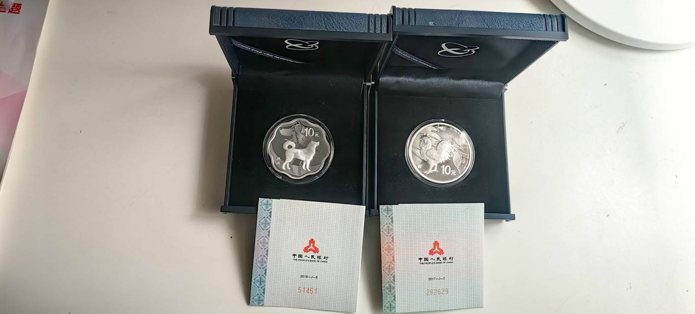 30g圆形银币鸡,证书编号282629;30g梅花银币狗,证书编号为51451。一起售,650元一个;盒子均完好,1300元包品包京东空运