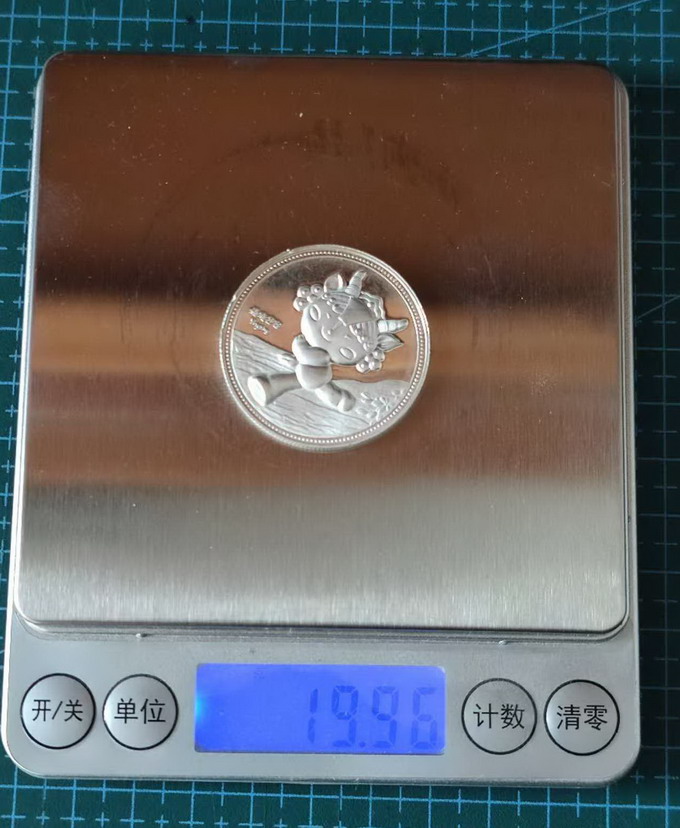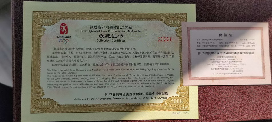 一套5枚,20克一枚,共100克,实际重量与证书相符,用吊水法测纯度为93.7%