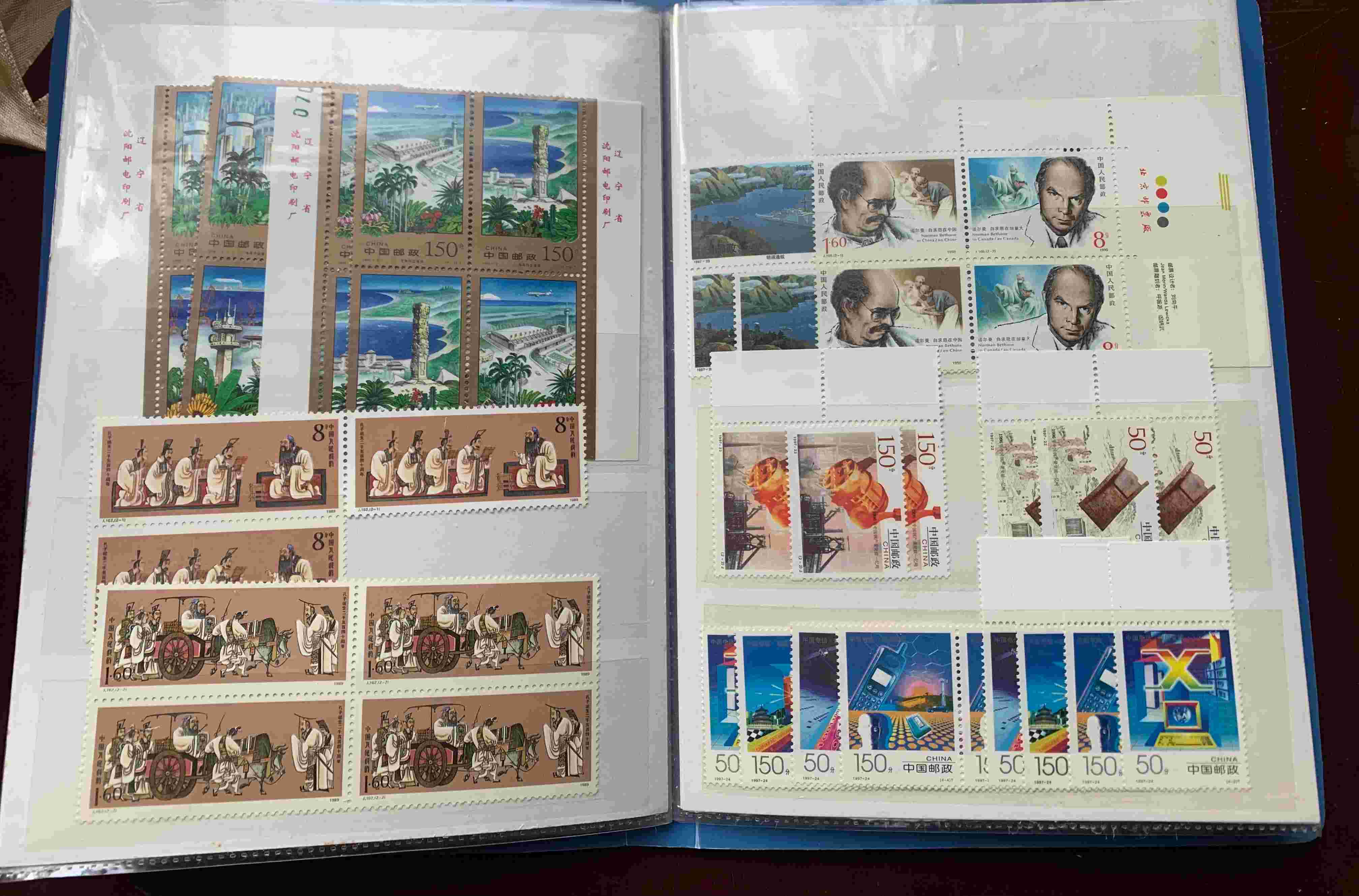 两照片内容:古代建筑、天山、西夏王陵、矿业大会、议会、盆景、邮政100周年各2套、环境保护5分16枚、内蒙古民居12枚。