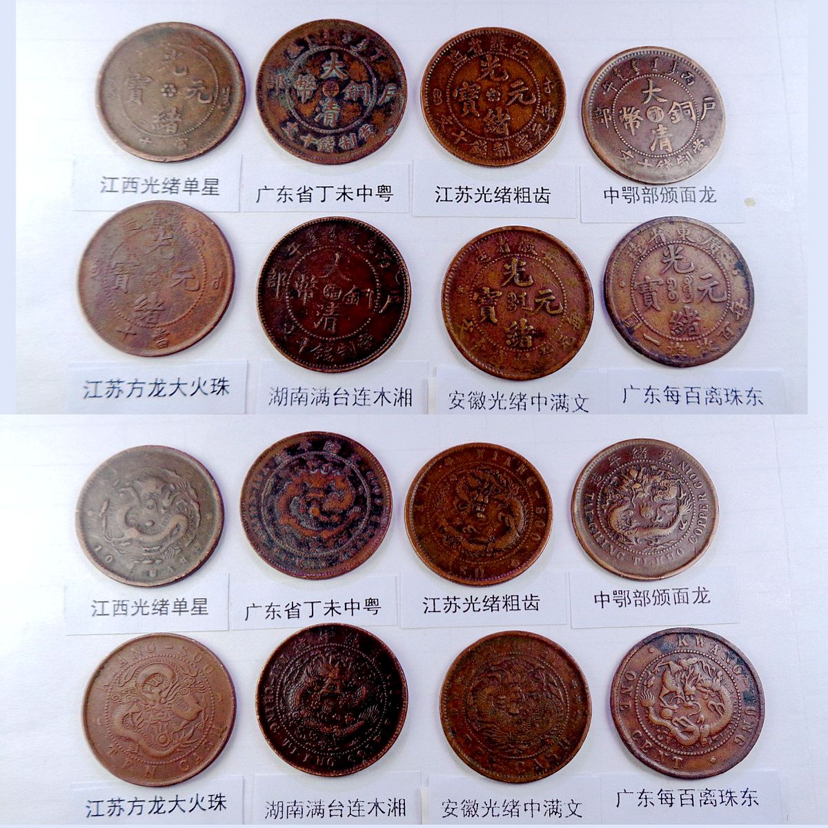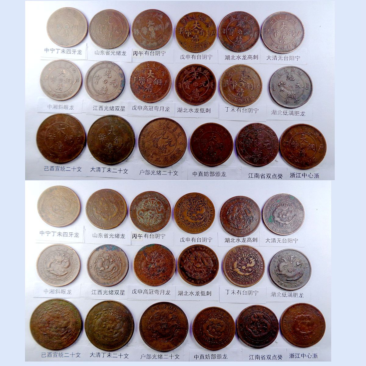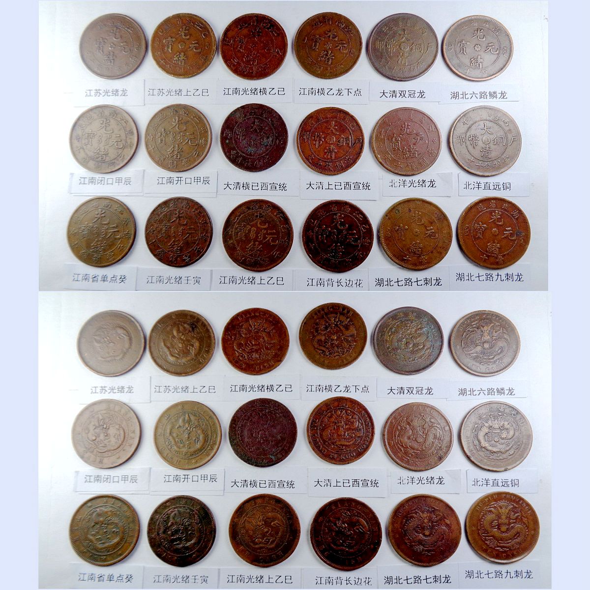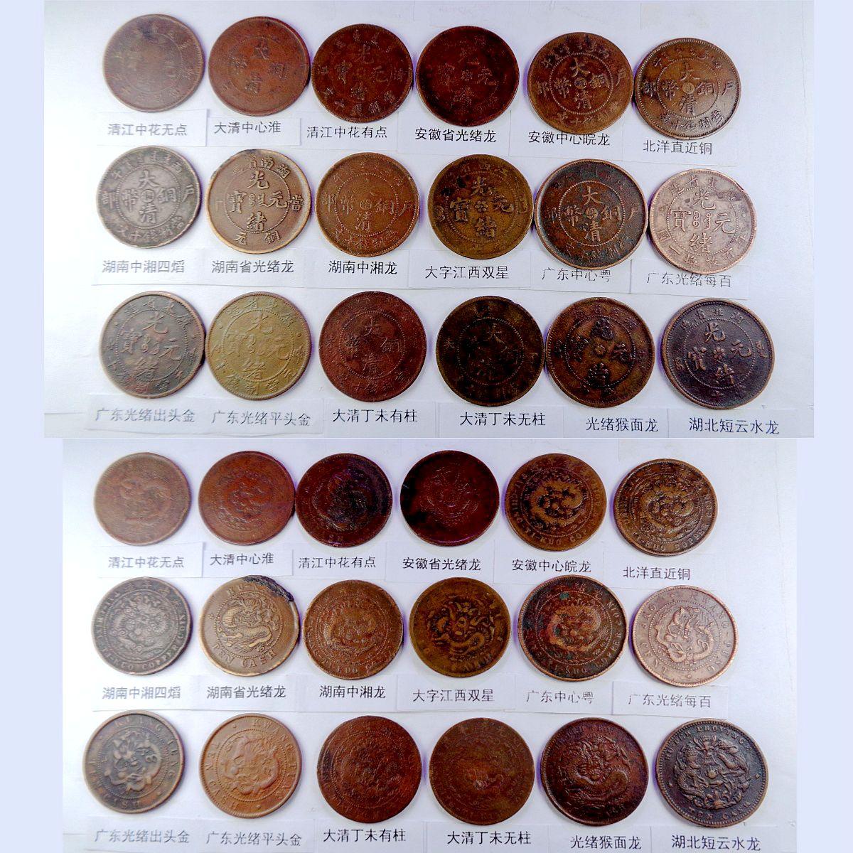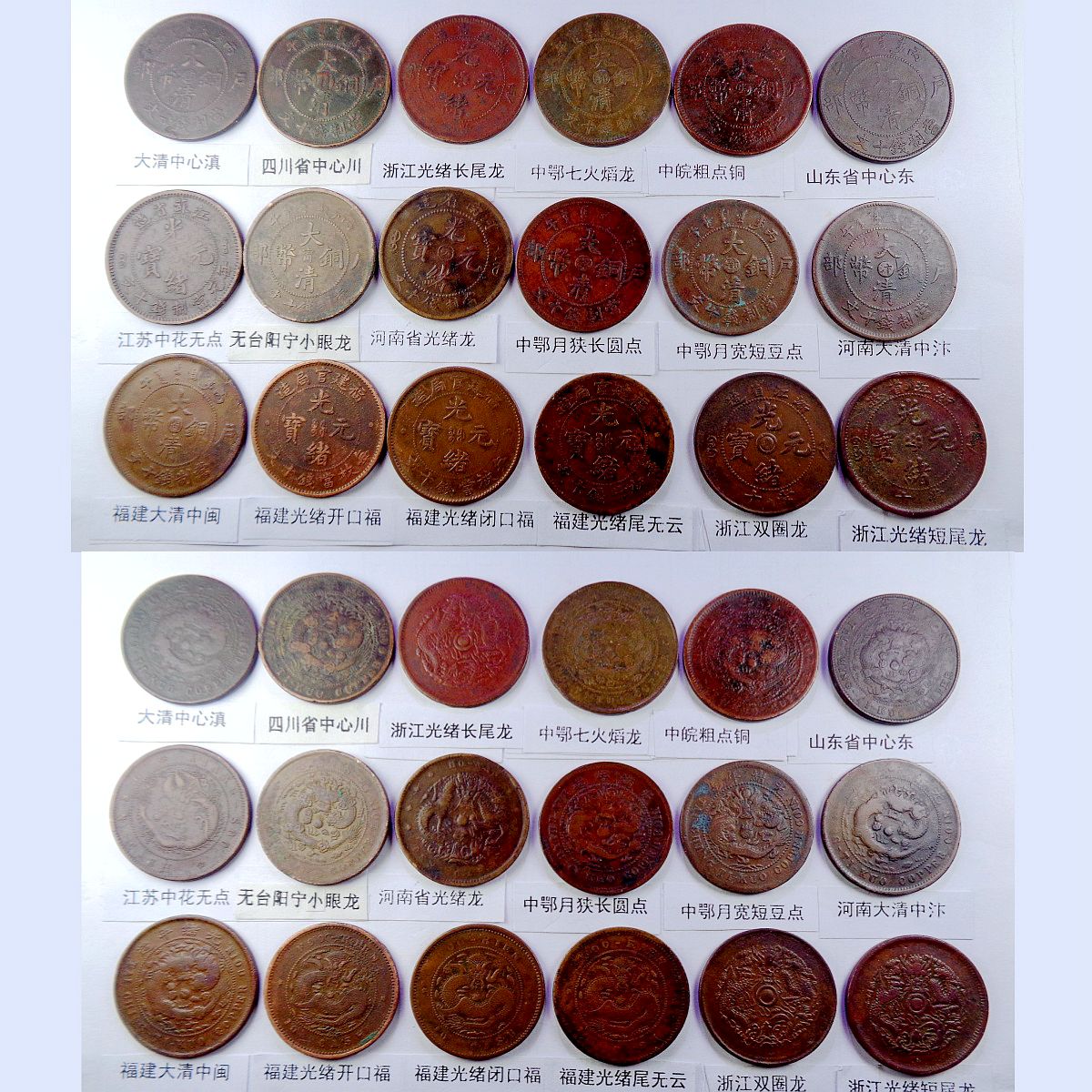 都是巧克力包浆和黑牡丹包浆,具体品种是: 江苏光绪龙(9级) 江苏光绪上乙已(8级) 江南光绪横乙已 江南横乙龙下点(8级) 大清双冠龙(8级) 湖北6路鳞龙 大清横已酉宣统(9级) 大清上已酉宣统(9级) 江南闭口甲辰 江南开口甲辰 北洋光绪龙(9级) 北洋直远铜(9级) 江南省单点癸(9级) 江南光绪壬寅(9级) 江南光绪上乙已(9级) 江南背长边花(8级) 湖北7路7刺龙 湖北7路9刺龙 清江中花无点 清江中心淮(8级) 清江中花有点 安徽省光绪龙 安徽中心皖 北洋直近铜(9级) 湖南中湘四焰 湖南省光绪龙 湖南中湘龙 大字江西双星(9级) 广东中心粤(9级) 广东光绪每百(8级) 广东光绪平头金 广东光绪出头金 大清丁未有柱 大清丁未无柱 光绪猴面龙(9级) 湖北短云水龙(9级) 大清中心滇(8级) 四川省中心川(8级) 浙江光绪长尾龙 中鄂七火焰龙 中皖粗点铜(9级) 山东省中心东(8级) 江苏中花无点(9级) 无台阳宁小眼龙(9级) 河南省光绪龙 中鄂月狭长圆点 中鄂月宽短豆点 河南大清中汴(9级) 福建大清中闽(9级) 福建光绪开口福 福建光绪闭口福 福建光绪尾无云(9级) 浙江双圈龙(9级) 浙江光绪短尾龙 中宁丁未四牙龙(7级) 山东省光绪龙(8级) 丙午有台阴宁(8级) 戊申有台阴宁 湖北水龙高剌 大清无台阳宁(9级) 中湘斜眼龙(9级) 江西光绪双星(9级) 戊申高冠弯月龙(9级) 湖北水龙低剌 丁未有台阴宁(8级) 湖北低满肥龙(9级) 已酉宣统二十文(9级) 大清丁未二十文 户部光绪二十文 中直妨部颁龙 江南省双点癸 (9级) 浙江中心浙(8级) 江西光绪单星(9级) 广东省丁未中粤(8级) 江苏光绪粗齿(8级) 中鄂部颁面龙 江苏方龙大火珠(8级) 湖南满台连木湘(9级) 安徽光绪中满文(8级) 广东每百连珠东(8级) 。