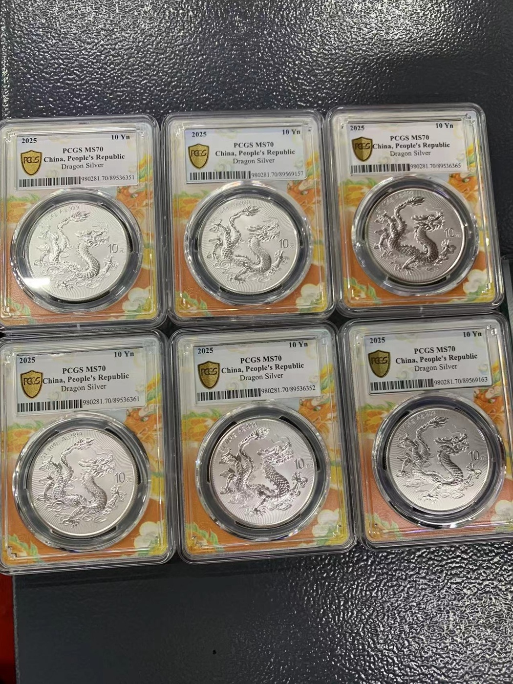 2025年发行的中国龙银币PCGSMS70分冠军分:6枚。全新好号