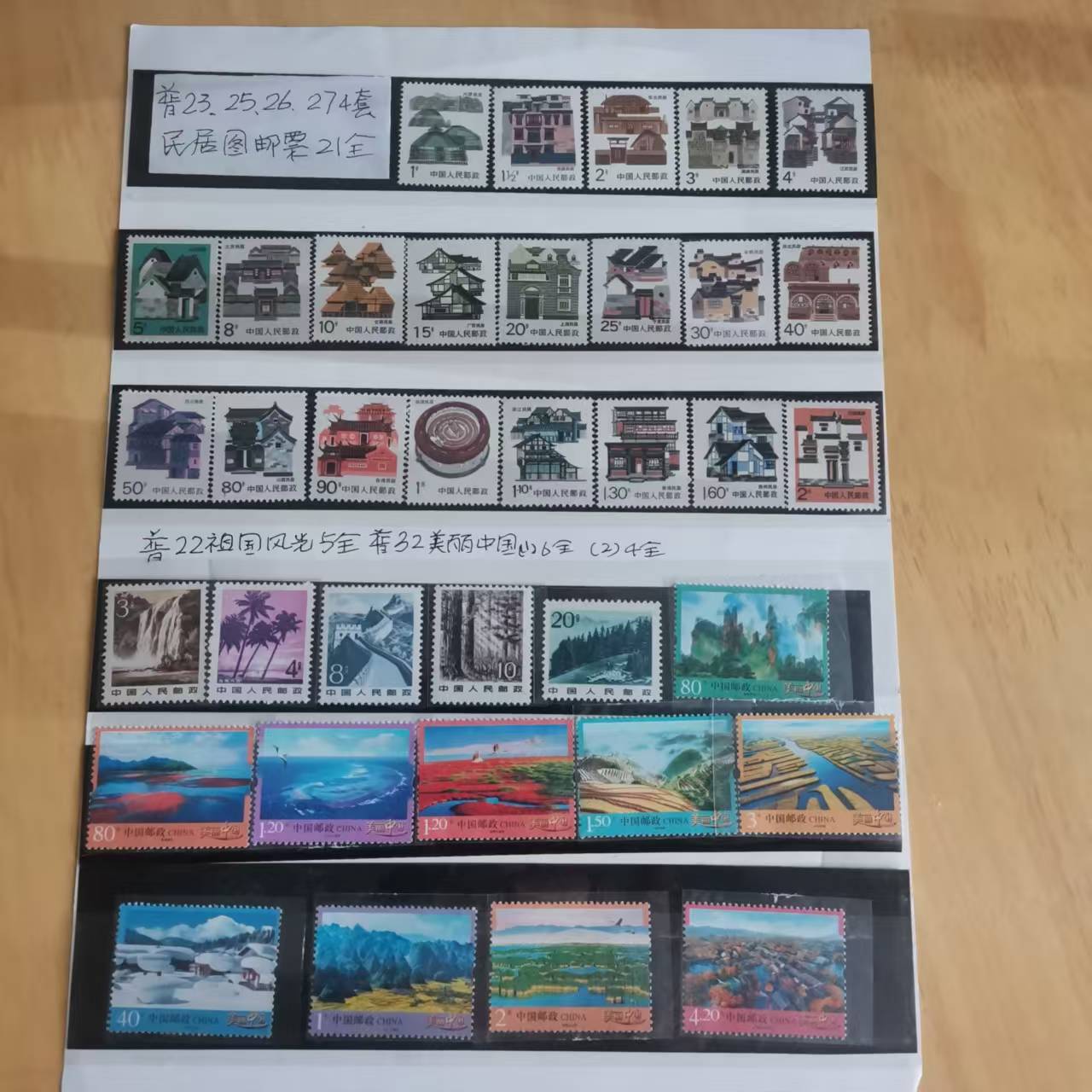 普23,25.26,27民居邮票21全1套20元。普22祖国风光5全1套10元。普32美丽中国(1)6全1套8元有5套,普32美丽中国(2)4全1套7元有4套。