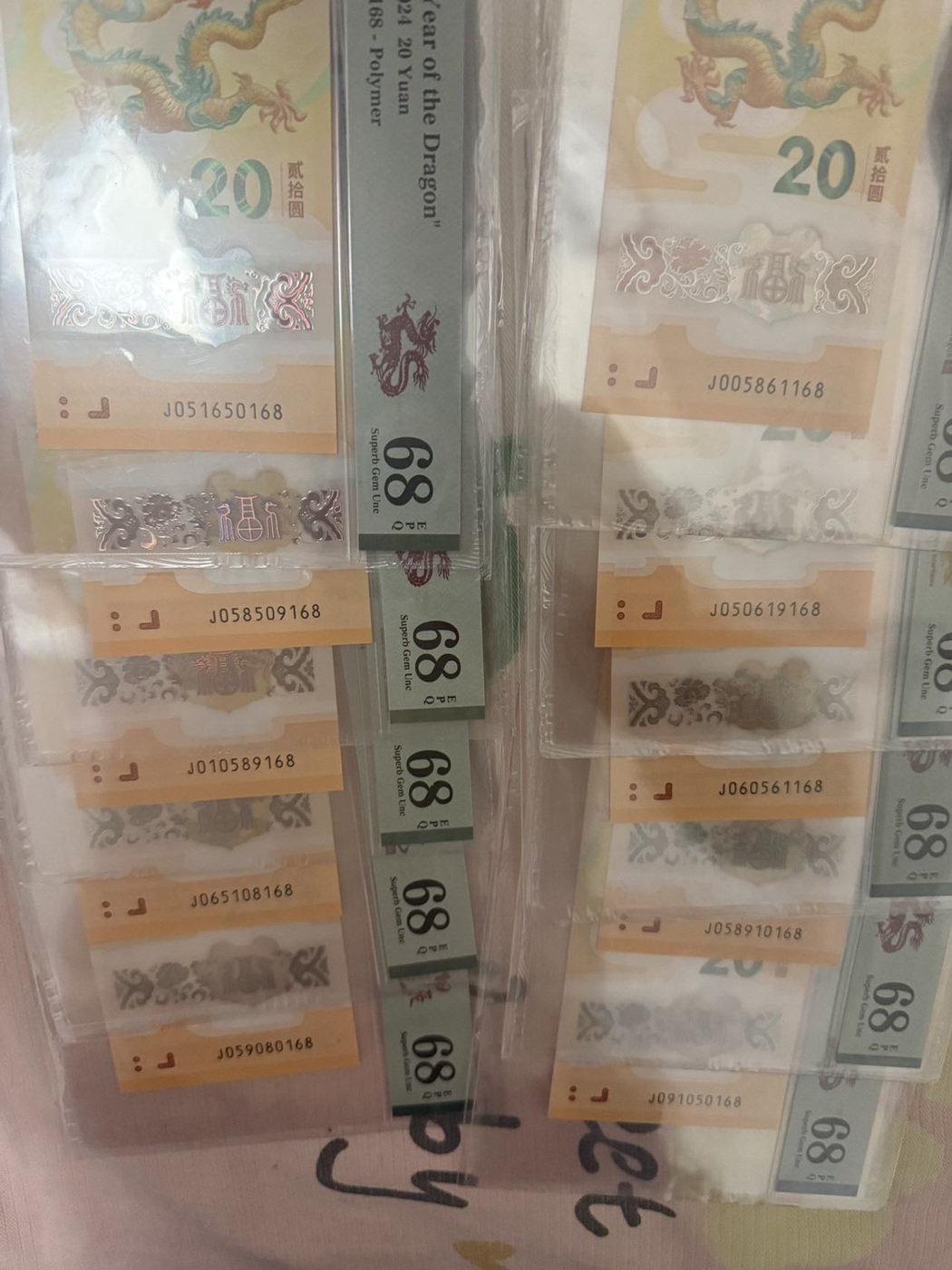出10张龙钞金马号168尾,均PMG68分,部分01568组合,2600/张通走,联系微信:17755819936