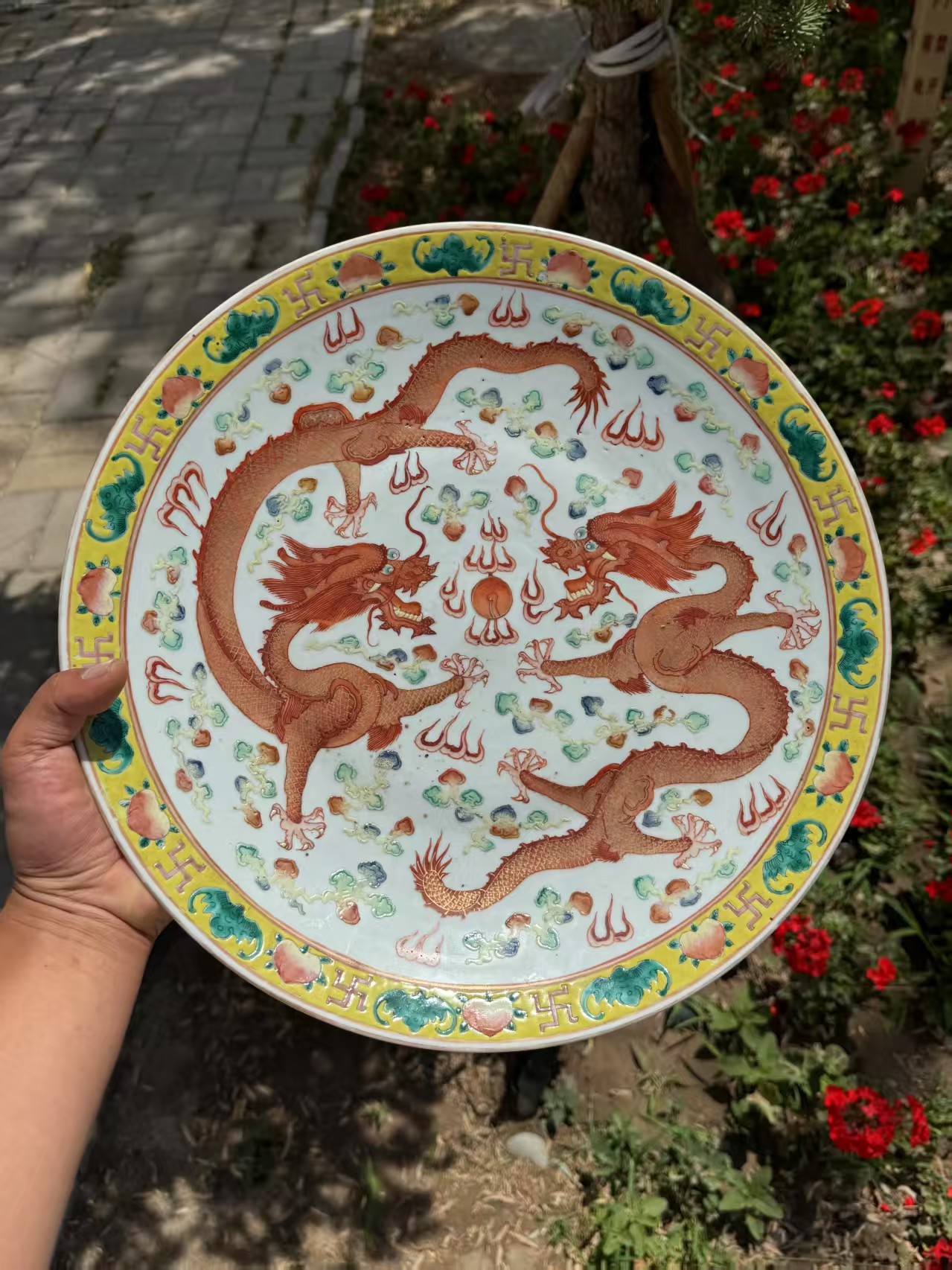 收藏首选,粉彩矾红双龙大盘38厘米