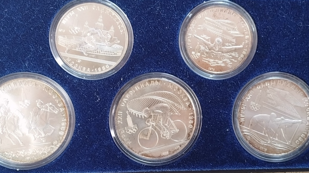 纯银币售价2100包快递 Ag 900银 折合16元一克 莫斯科奥运会纪念银币一套六枚 2枚5卢布银币,3枚10卢布银币,总重132.5克左右 正面刻有苏联国徽和"СССР"字样,背面展示莫斯科、明斯克、列宁格勒、基辅、塔林等苏联城市景观,带有奥运会标志。