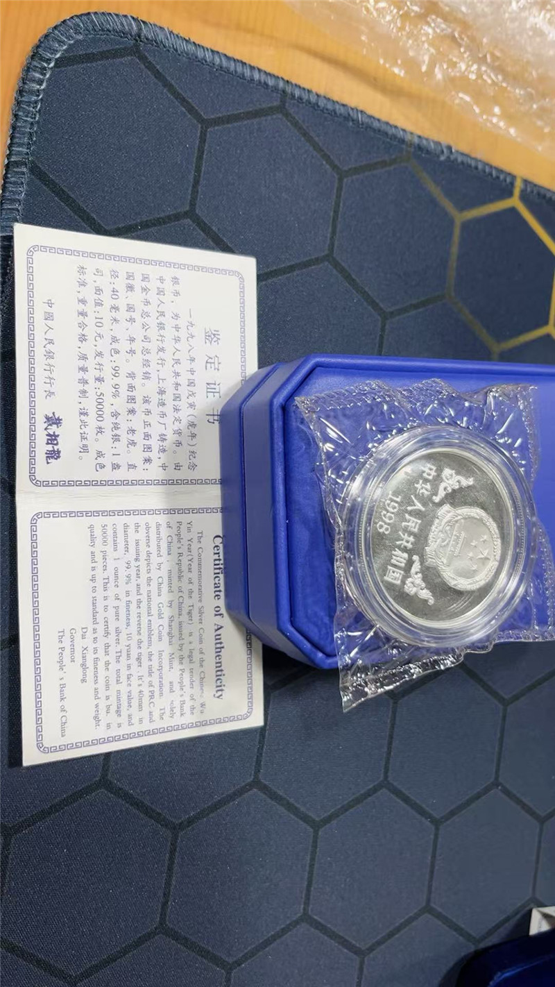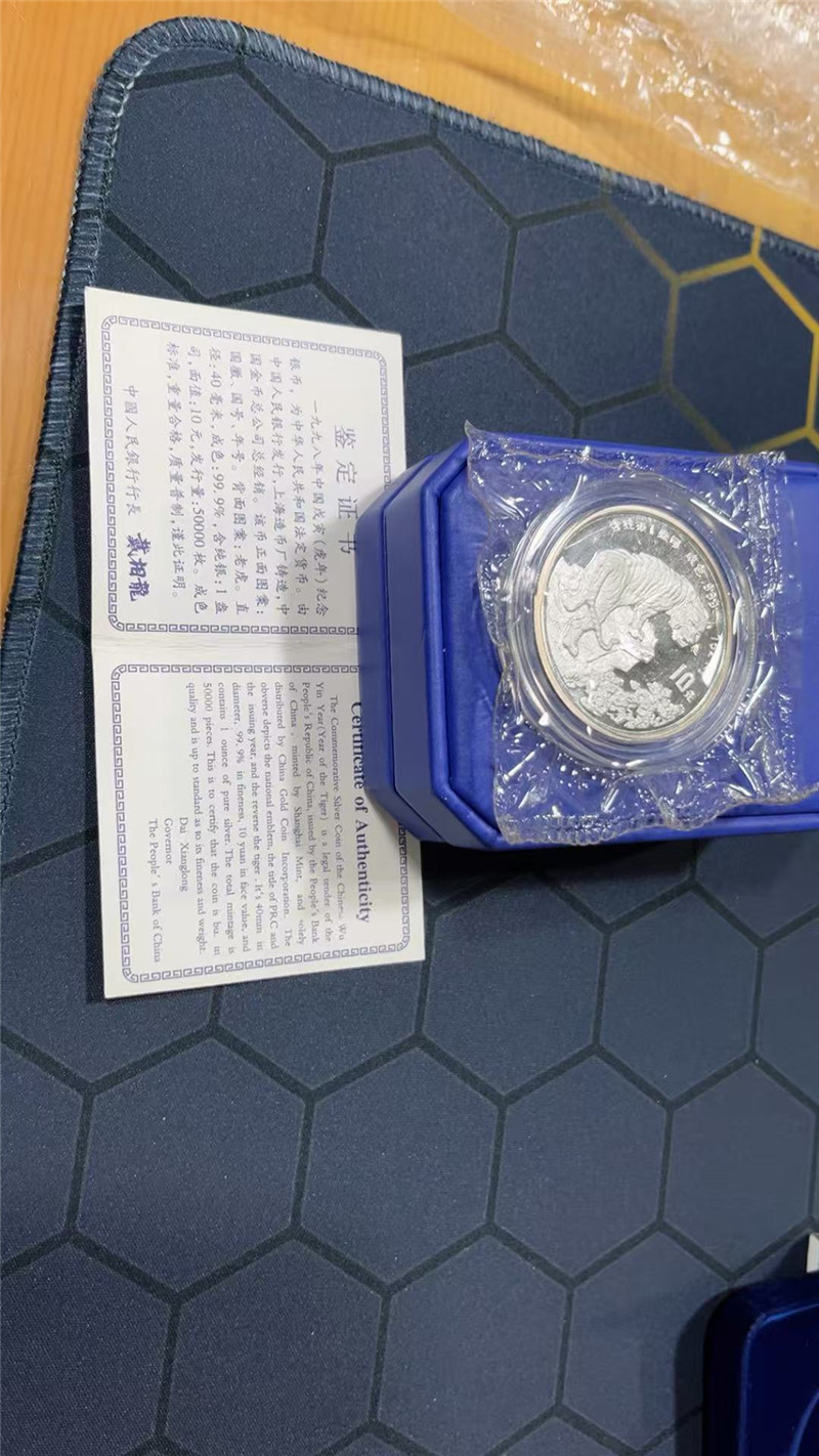 → 1998年中国戊寅虎生肖纪念币1盎司 本色银虎 证书