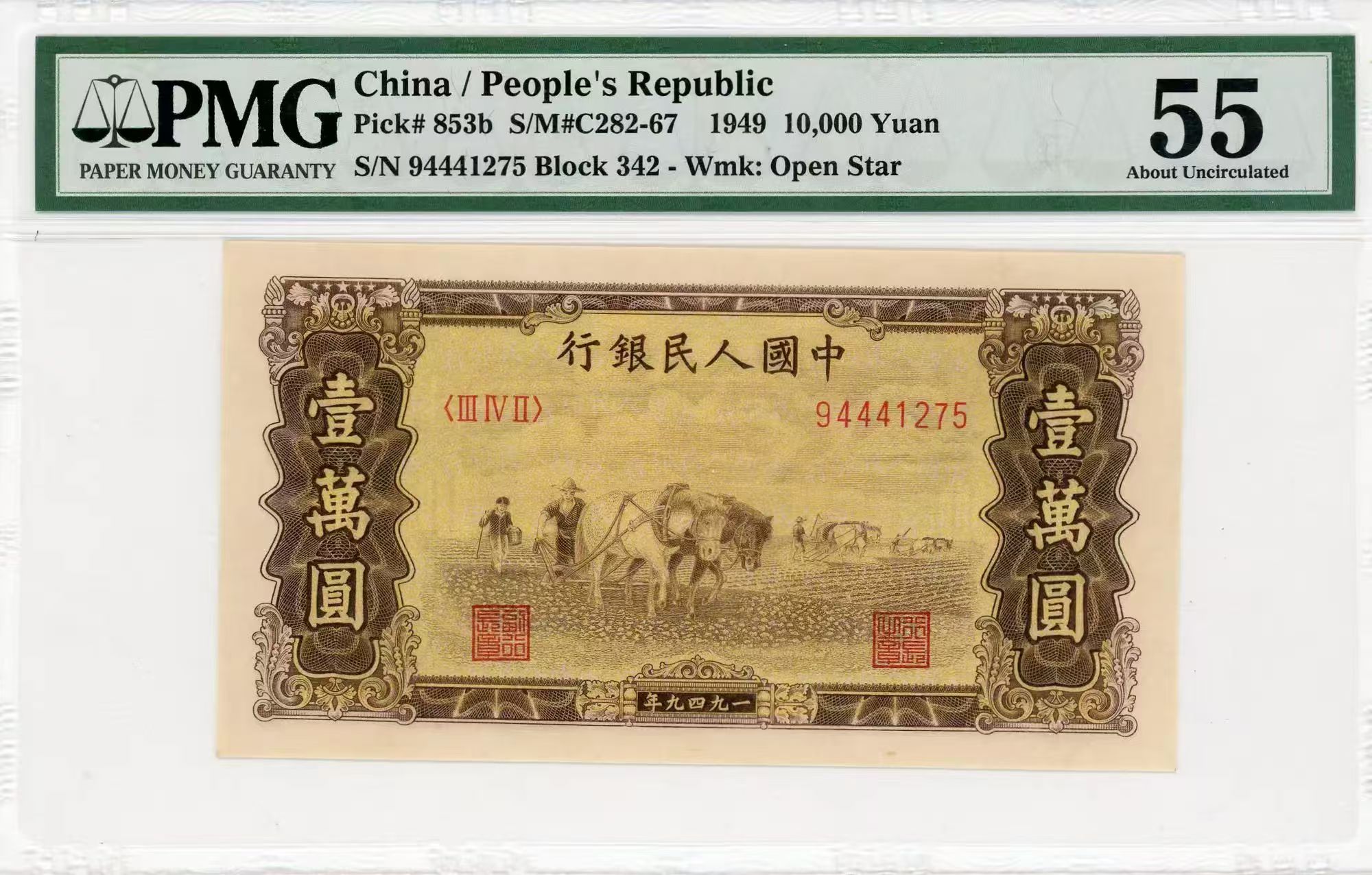 出售 一版双马耕地 星水印 PMG55