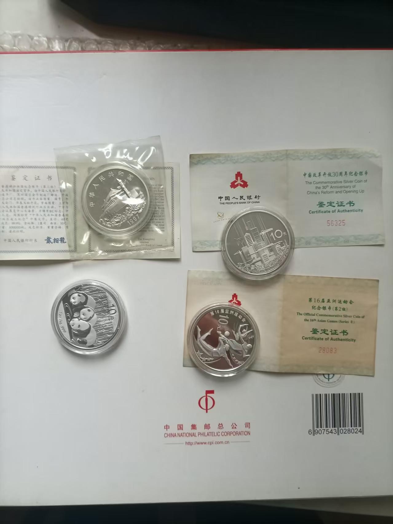 出一盎司银币4枚,香港回归三,改革开放30周年,16届亚运会,13年熊猫银币,都是一盎司,有盒有证书,585元一枚包顺丰,可微信看图。