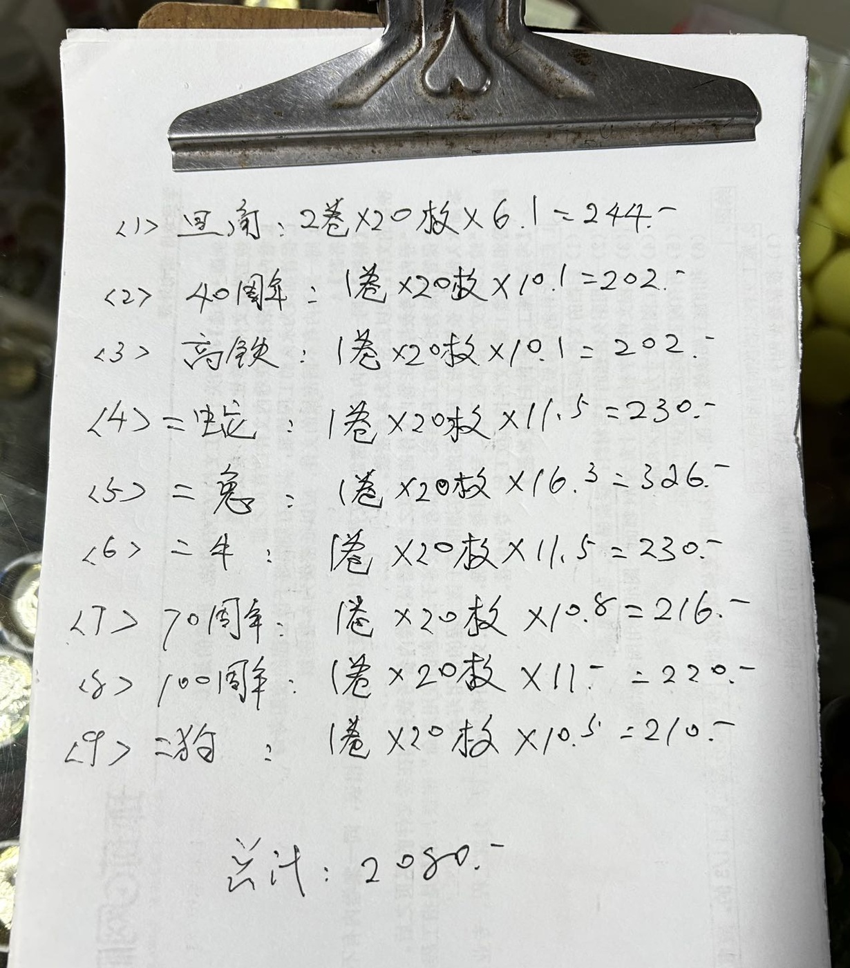 旦角、40周年、高铁、蛇、兔、牛、70周年、100周年、狗。