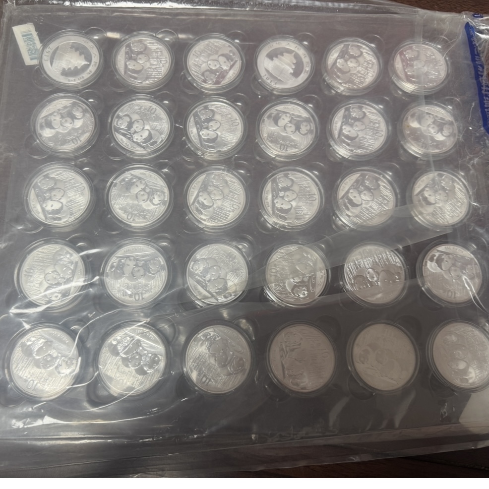 610/枚出2014年盎司银熊猫整板30枚,币全品,塑料袋有开口如图,确认请电联。