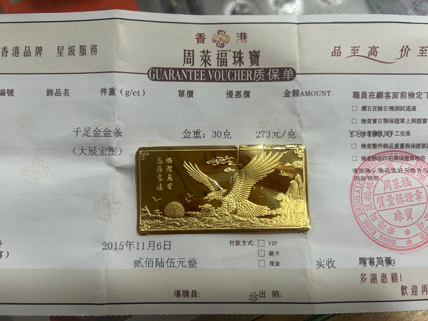 五:香港周来福30克金条,带发*票,金条中间剪过验货,融通金加5元/克。