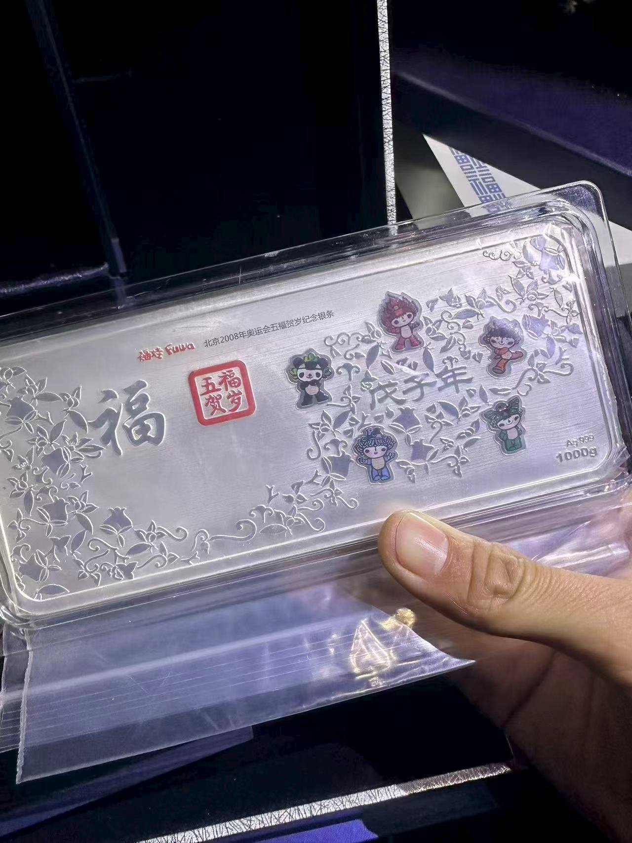 → 出1000克2008年奥运会五福贺岁纪念银条