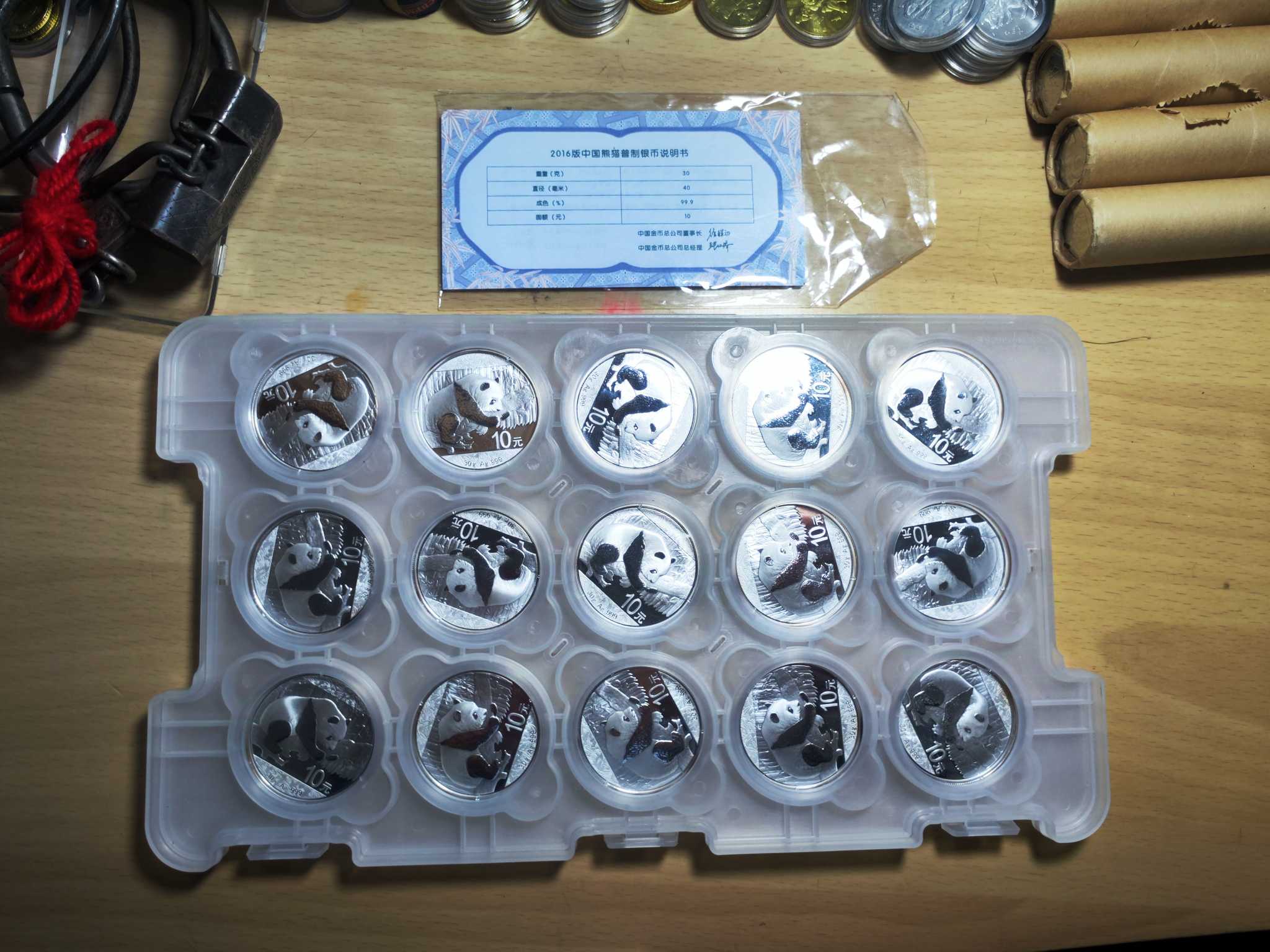2016年熊猫银币一板15枚 有几枚有氧化 售价595元一枚 共计8925元包顺丰