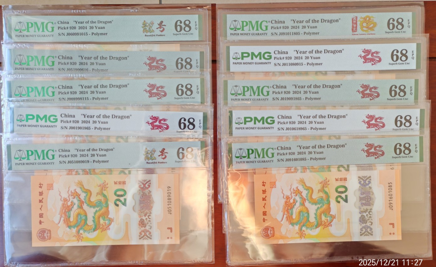 低价1200元出售龙钞金马号PMG68分10张:其中包括8张尾5独5,一马平川、唯五独尊、