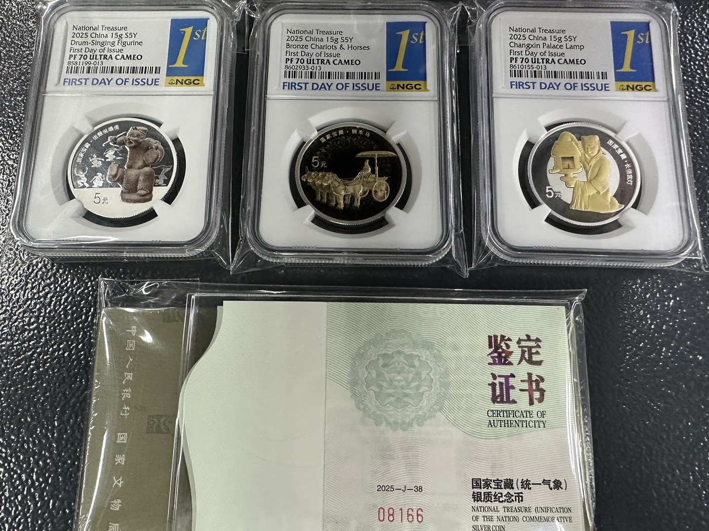 国家宝藏统一气象银套币3枚15克精制银币:1套,面值5元,图案分别是铜车马、长信宫灯、击鼓说唱俑。NGC首日金蓝标!全部70分。分数见图。