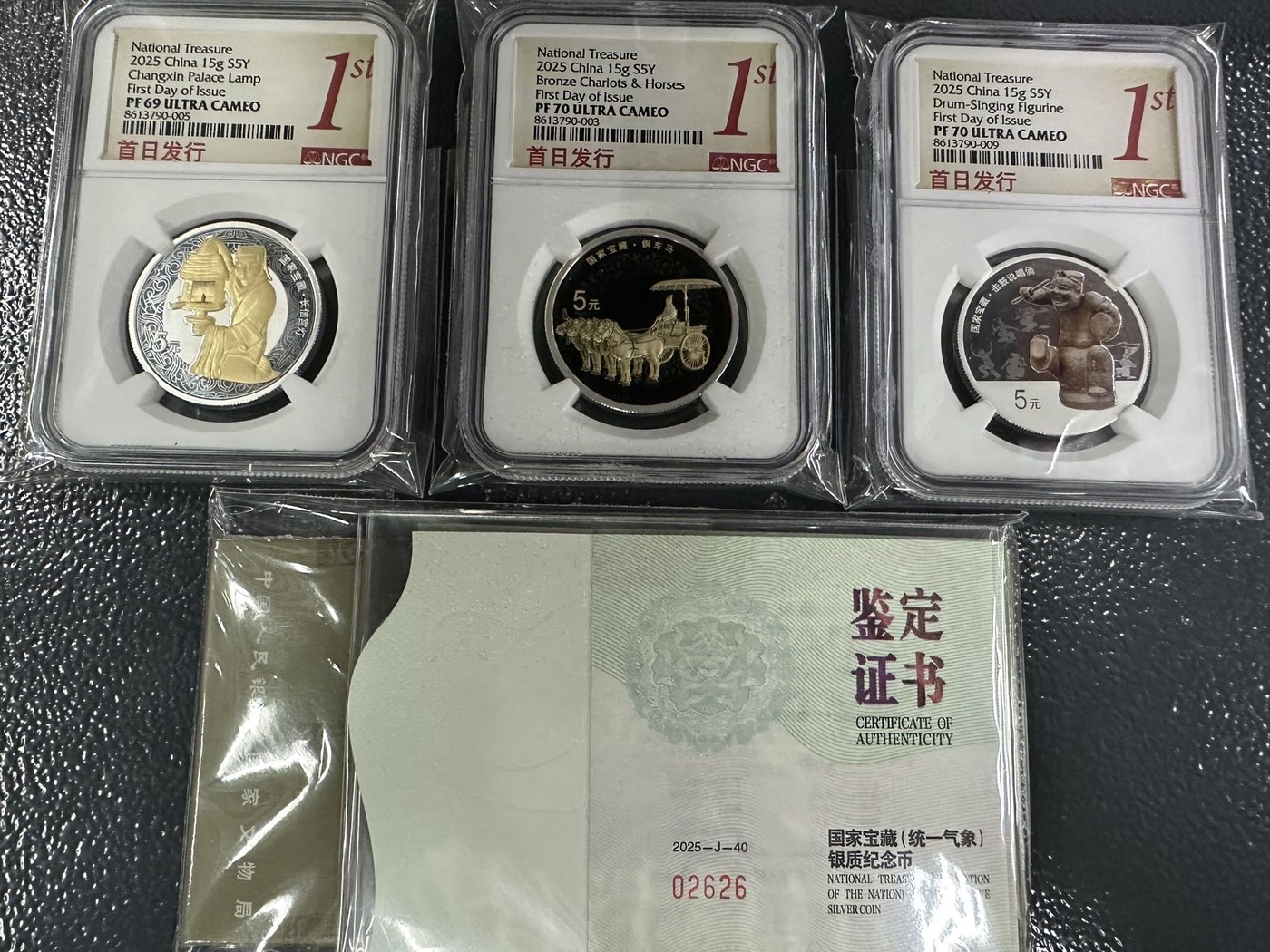 国家宝藏统一气象银套币3枚15克精制银币:1套,面值5元,图案分别是铜车马、长信宫灯、击鼓说唱俑。NGC首日标。