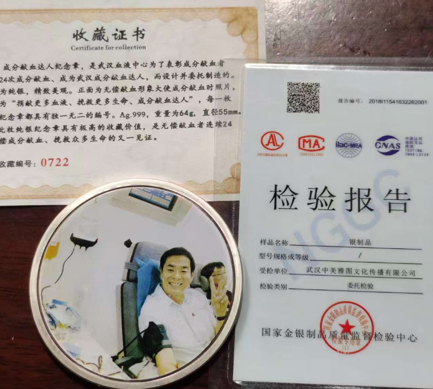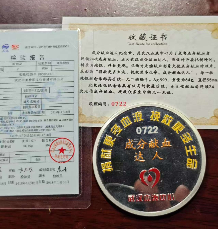 成分献血纪念章 限量发行银章65克,第0722号 带证书 1350元