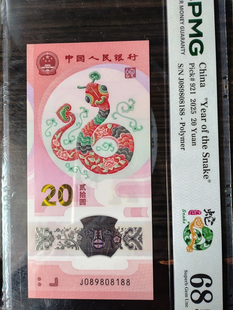 PMG评级68分倒置号8蛇钞,089808198。1500元三包,