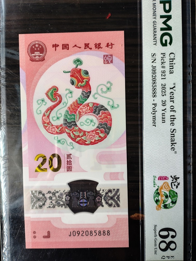 PMG评级68分无347豹子888蛇钞标十(副币裸钞),092085888。4500元三包。