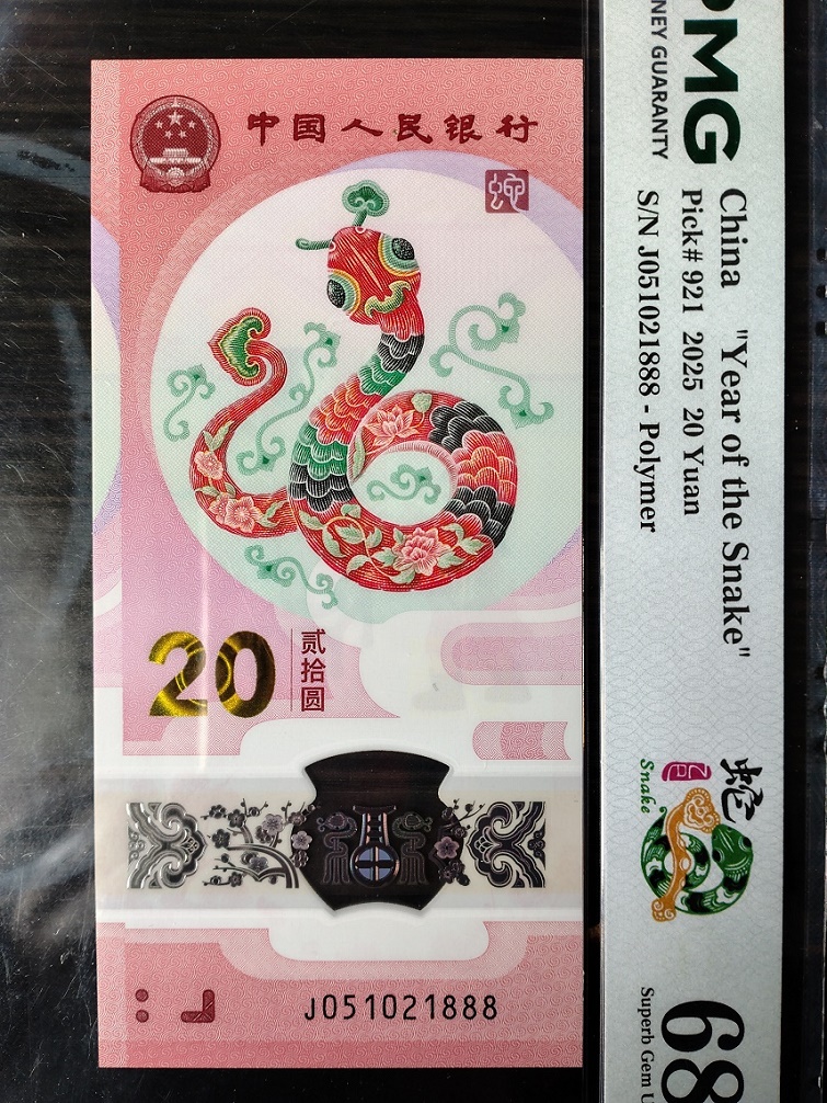 PMG评级68分无347豹子888蛇钞标十(副币裸钞),051021888。4500元三包。