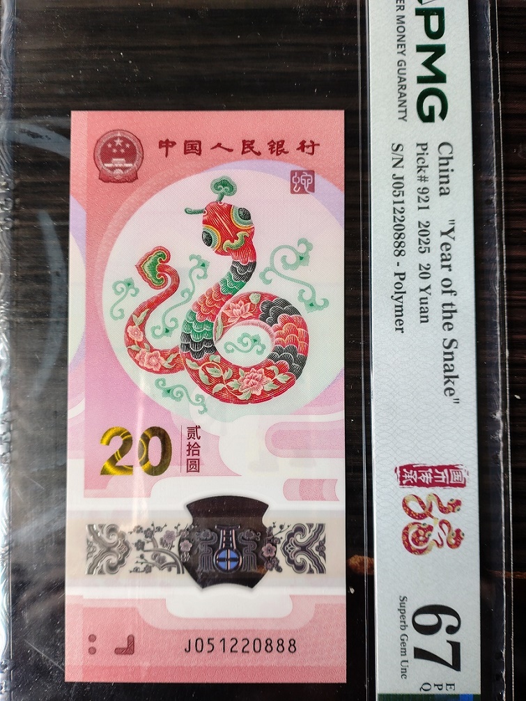 PMG评级67分无347豹子888蛇钞标十(副币裸钞),051220888。3500元三包。