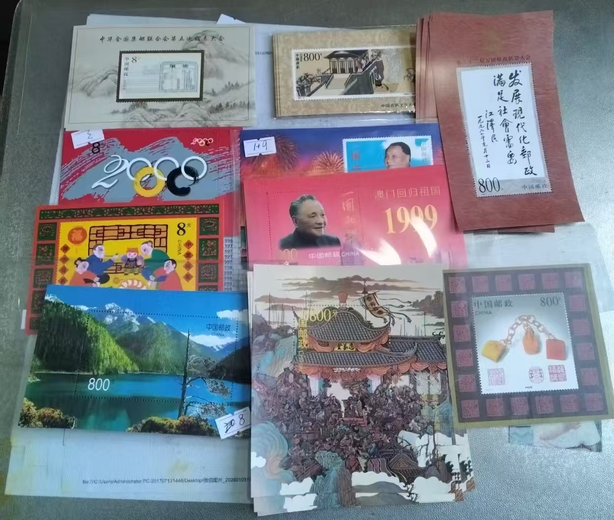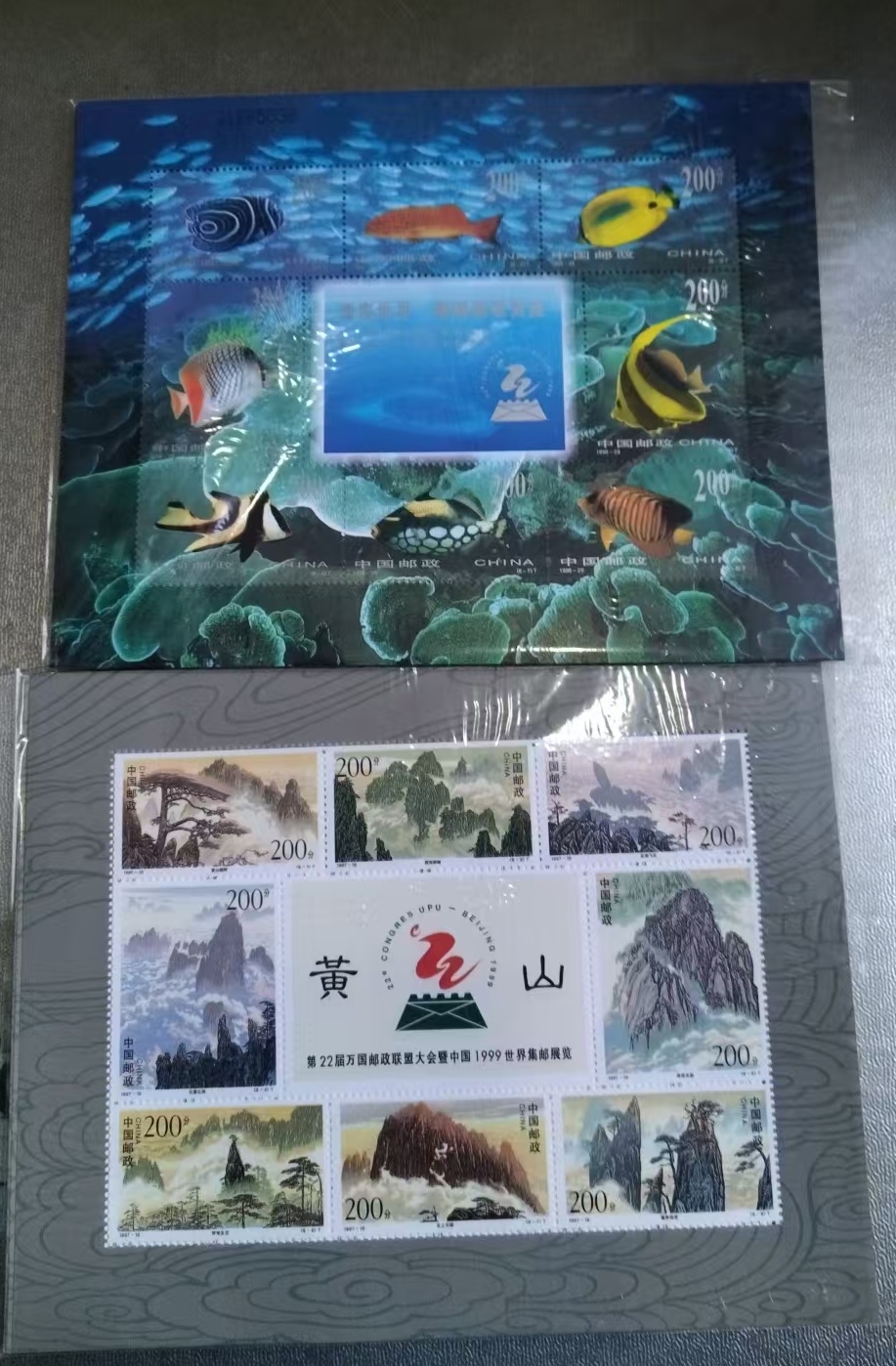 8元面值小型张60枚,一起出4块钱一枚品种如图。海底世界和黄山各25版一共50版,7.8元一版。