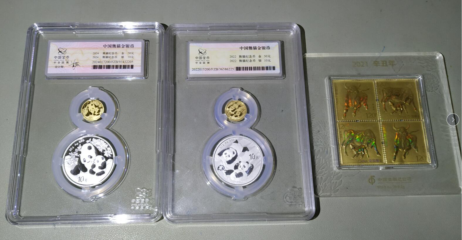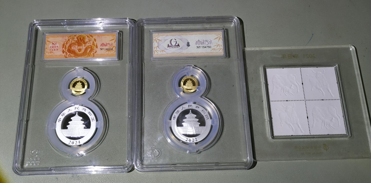 3克金猫2个,30克银猫2个,牛年邮票金2克。黄金8克*998元,白银60克*19元