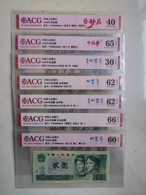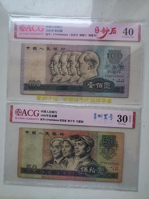 双豹子倒置号2枚(805,8001三冠);大司令倒置豹子号1枚(802)。由此可见,本套币不仅集各种倒置号精品之大成,而且均已经过爱藏严评,真假无忧,品相透明。另附精美珍藏册和手提袋,从号码币的角度来说,应该说这就是一件顶级藏品了,目前来看全网唯一。本人关注倒置号多年,其间不断的多网搜索,至今未发现全品相的80100和8050尾号666的倒置豹子号,80100只见到本套中的这一张,8050也只见到3张(包括本套中的一张),而且都是中等偏下的流通品,实在是太稀缺了。注:1角和5角共4张为赠品,分别为ACG68E和67E(8005);ACG67E和65E(8001)。售价35000元,需要的私聊。
