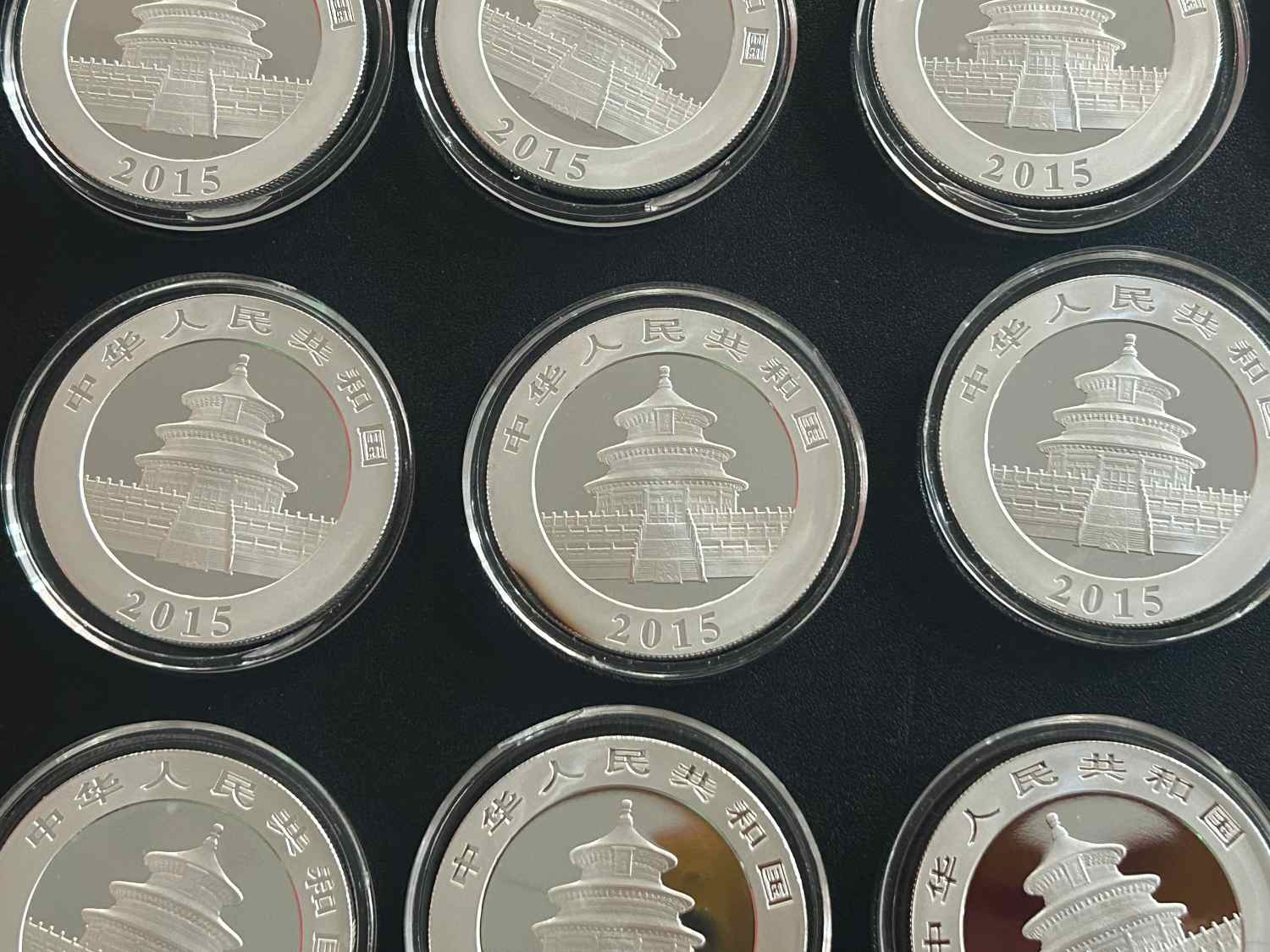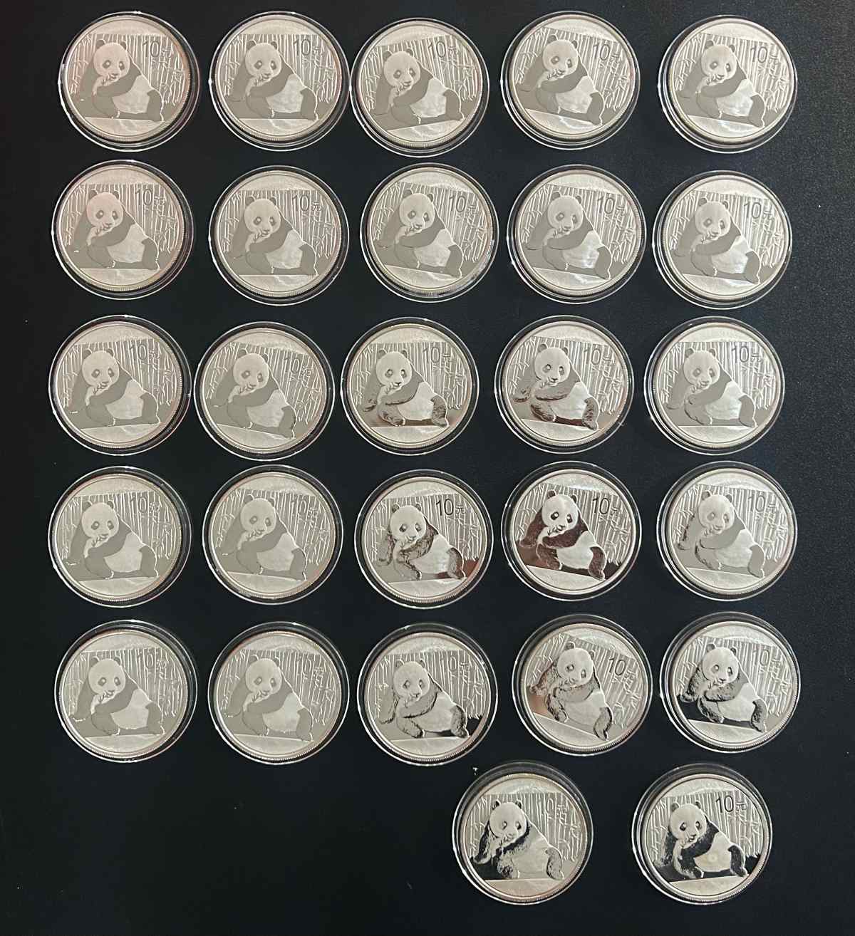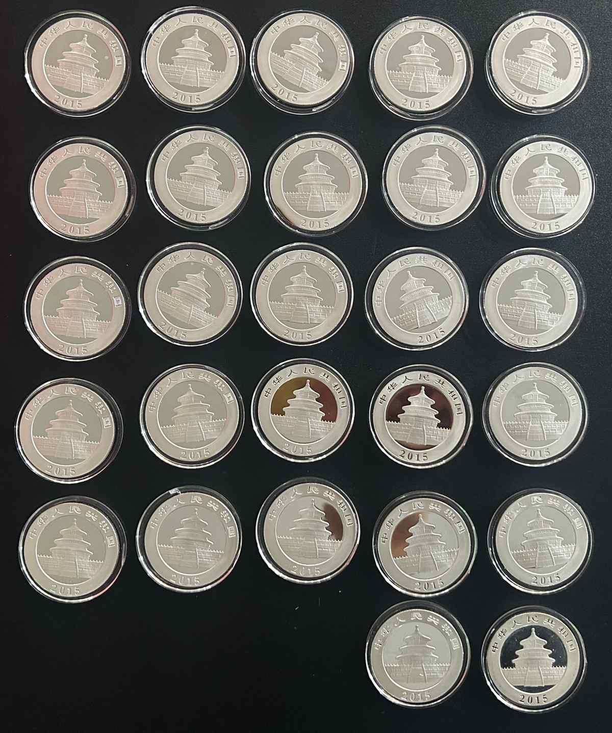 2015年熊猫银币27个,除3个差点其他都不错,但塑料外盒都比较花,有几个小裂,加几毛换个盒子就可以了,卖的是几乎银的价格,要求谨慎