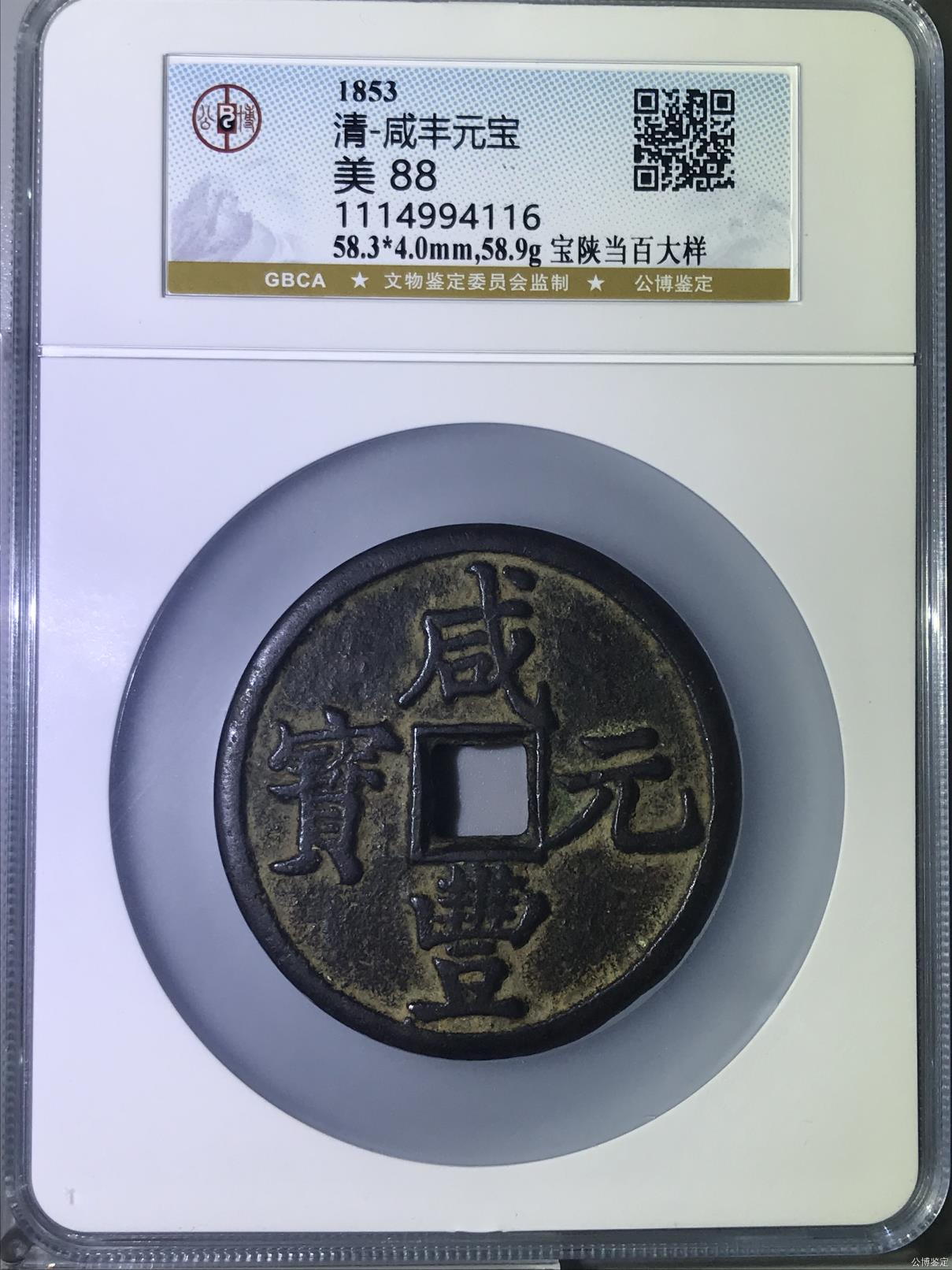 咸丰宝陕当百大样1枚,传世黑漆古包浆,字口一流清晰,北京公博总部评级美88,三包1W包顺丰!