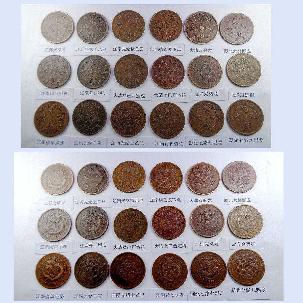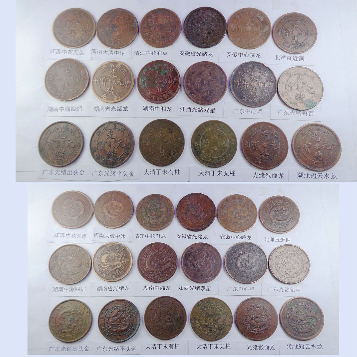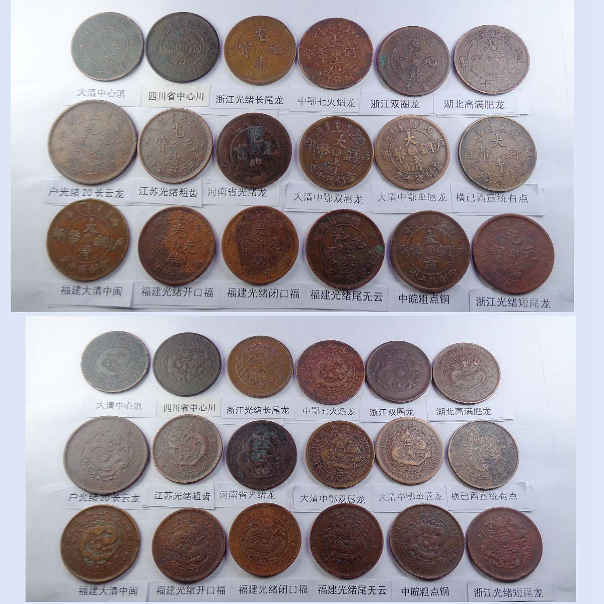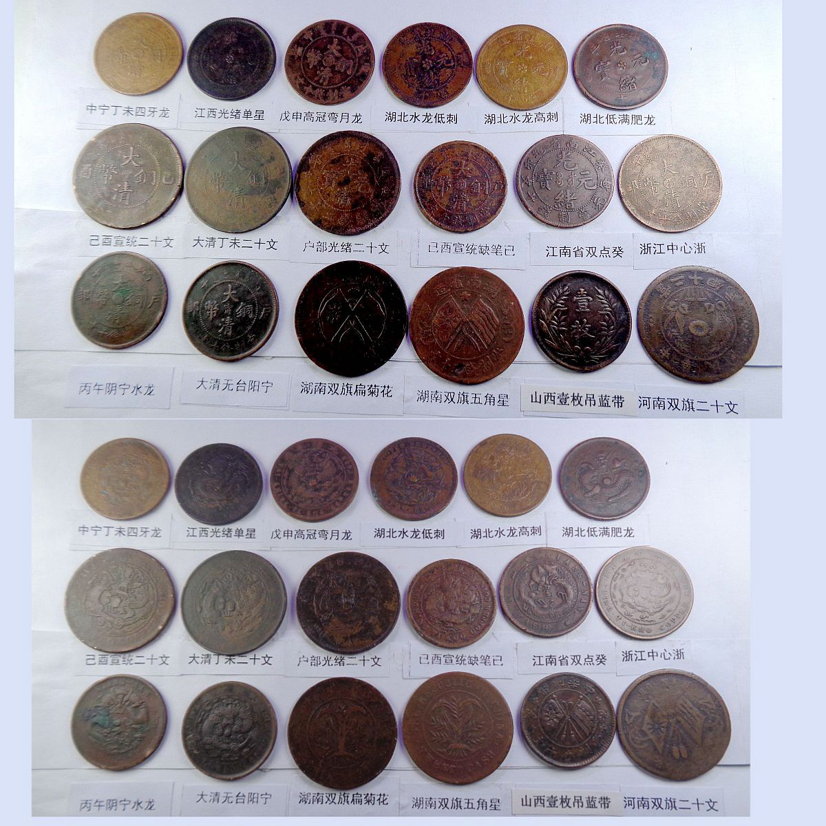 都是存世巧克力包浆和黑牡丹包浆。所售钱币终身包老包真。假*币包退赔。具体品种是: 江苏光绪龙 江苏光绪上乙已 江南光绪横乙已 江南横乙龙下点 大清双冠龙 湖北6路鳞龙 江南闭口甲辰 江南开口甲辰 大清横已酉宣统 大清上已酉宣统 北洋光绪龙 北洋直远铜 江南省单点癸 江南光绪壬寅 江南光绪上乙已 江南背长边花 湖北7路7刺龙 湖北7路9刺龙 江苏中花无点 河南大清中汴 清江中花有点 安徽光绪龙 安徽中心皖 北洋直近铜 湖南中湘四焰 湖南省光绪龙 湖南中湘龙 江西光绪双星 广东中心粤 广东光绪每百 广东光绪平头金 广东光绪出头金 大清丁未有柱 大清丁未无柱 光绪猴面龙 湖北短云水龙 大清中心滇 四川省中心川 浙江光绪长尾龙 中鄂七火焰龙 浙江双圈龙 湖北高满肥龙 户光绪20长云 江苏光绪粗齿 河南省光绪龙 大清中鄂双唇 大清中鄂单唇 横已酉宣统有点 福建大清中闽 福建光绪开口福 福建光绪闭口福 福建光绪尾无云 中皖粗点铜 浙江光绪短尾龙 中宁丁未四牙龙 江西光绪单星 戊申高冠弯月龙 湖北水龙低剌 湖北水龙高剌 湖北低满肥龙 已酉宣统二十文 大清丁未二十文 户部光绪二十文 已酉宣统缺笔已 江南省双点癸 浙江中心浙 丙午阴宁水龙 大清无台阳宁 湖南双旗扁菊花 湖南双旗五角星 山西壹枚园缨币 河南双旗二十文 开国纪念空心圈 河南双旗十文 开国纪念大吊樱 开国纪念实心圈 广东省一仙铜币 民国党微一分 湖南禾花十文 开国纪念连叶 。