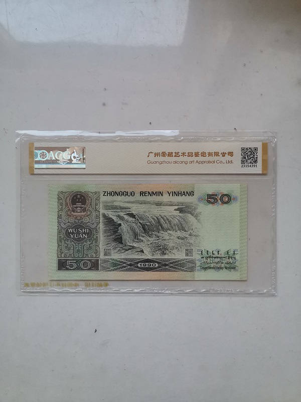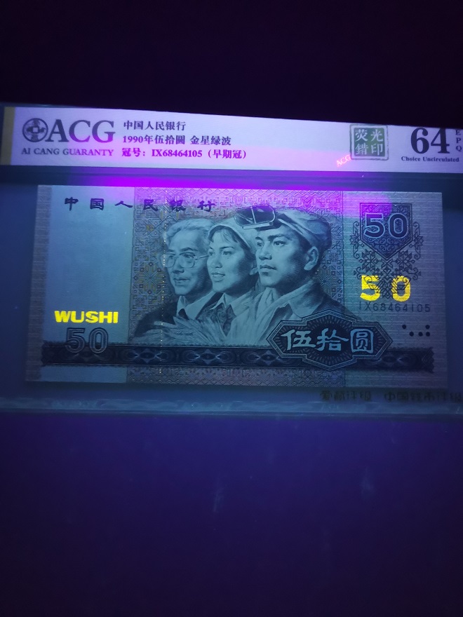 品如图,正面“银”字左边有一条竖直的点状荧光线,错的规规整整,明明白白,不懂的人还以为是一条安全防伪线呢。荧光版别叠加荧光错印正是本藏品的独特价值之所在,550元。