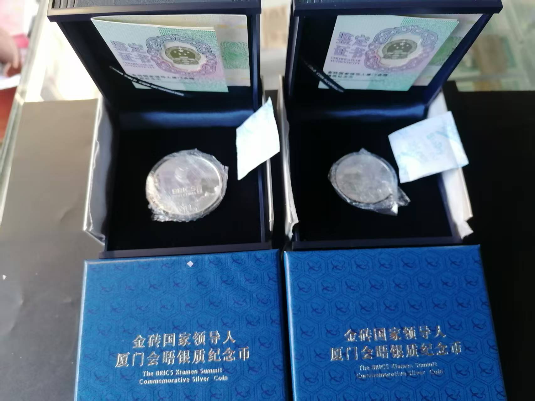 售:金砖国家会晤纪念银币4套,920元一套,每套2枚(30克+15克),四套证书号:38082;38083;39216;39219,盒证齐全完好,全品无氧化,三包到手电联确认为准!