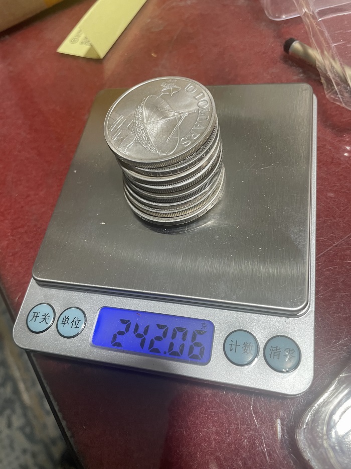 低于银价出9枚外国银币,9枚共重242克,总价3500元.