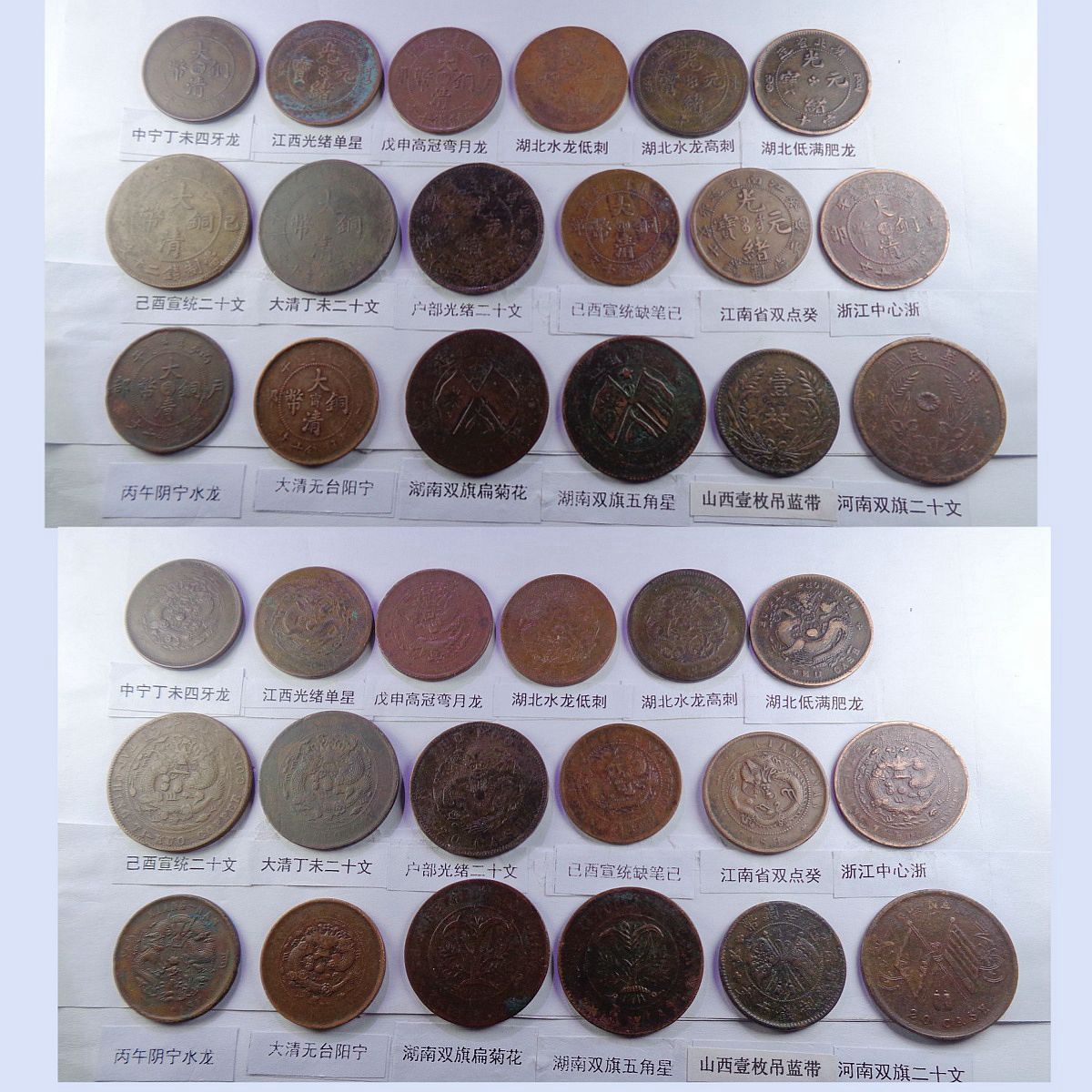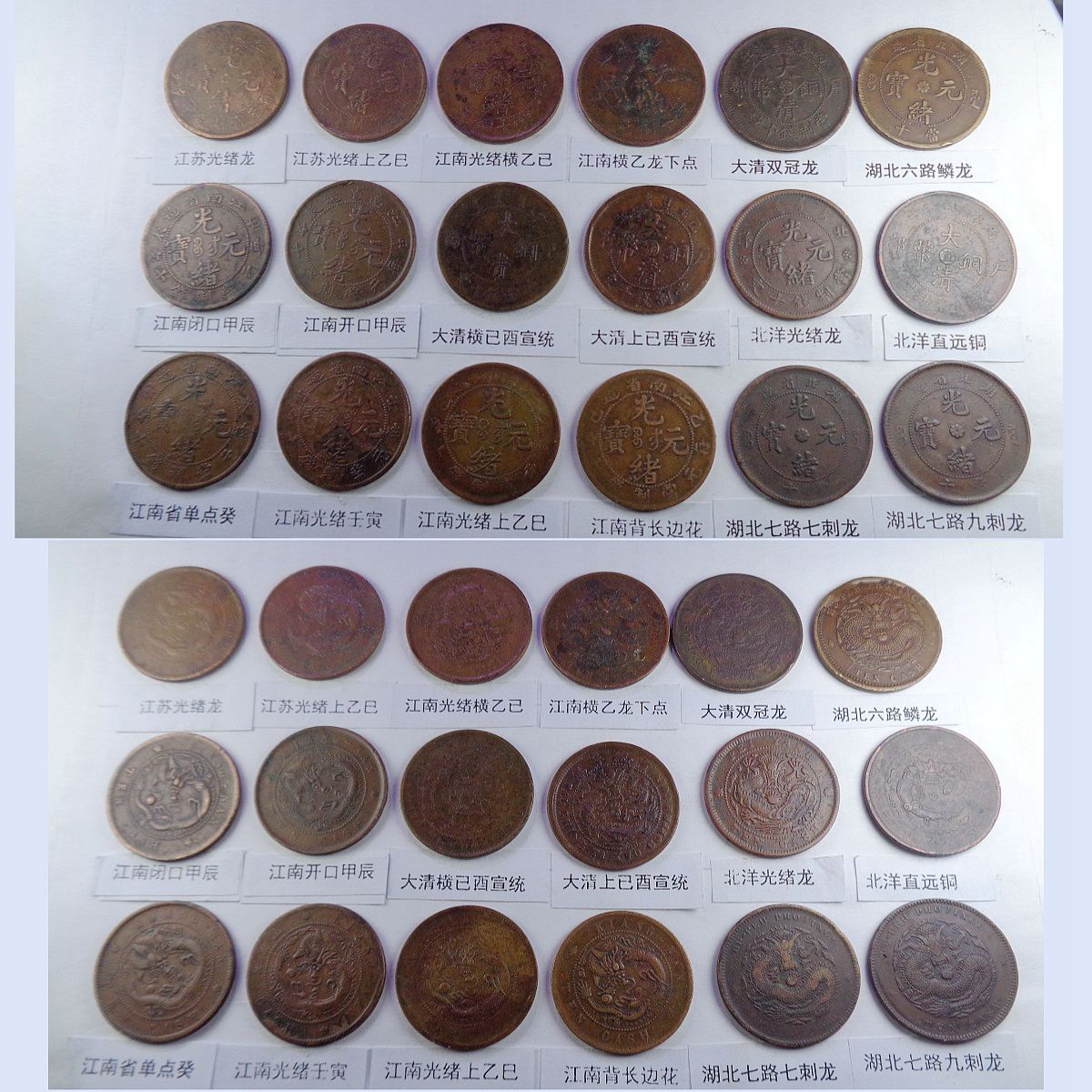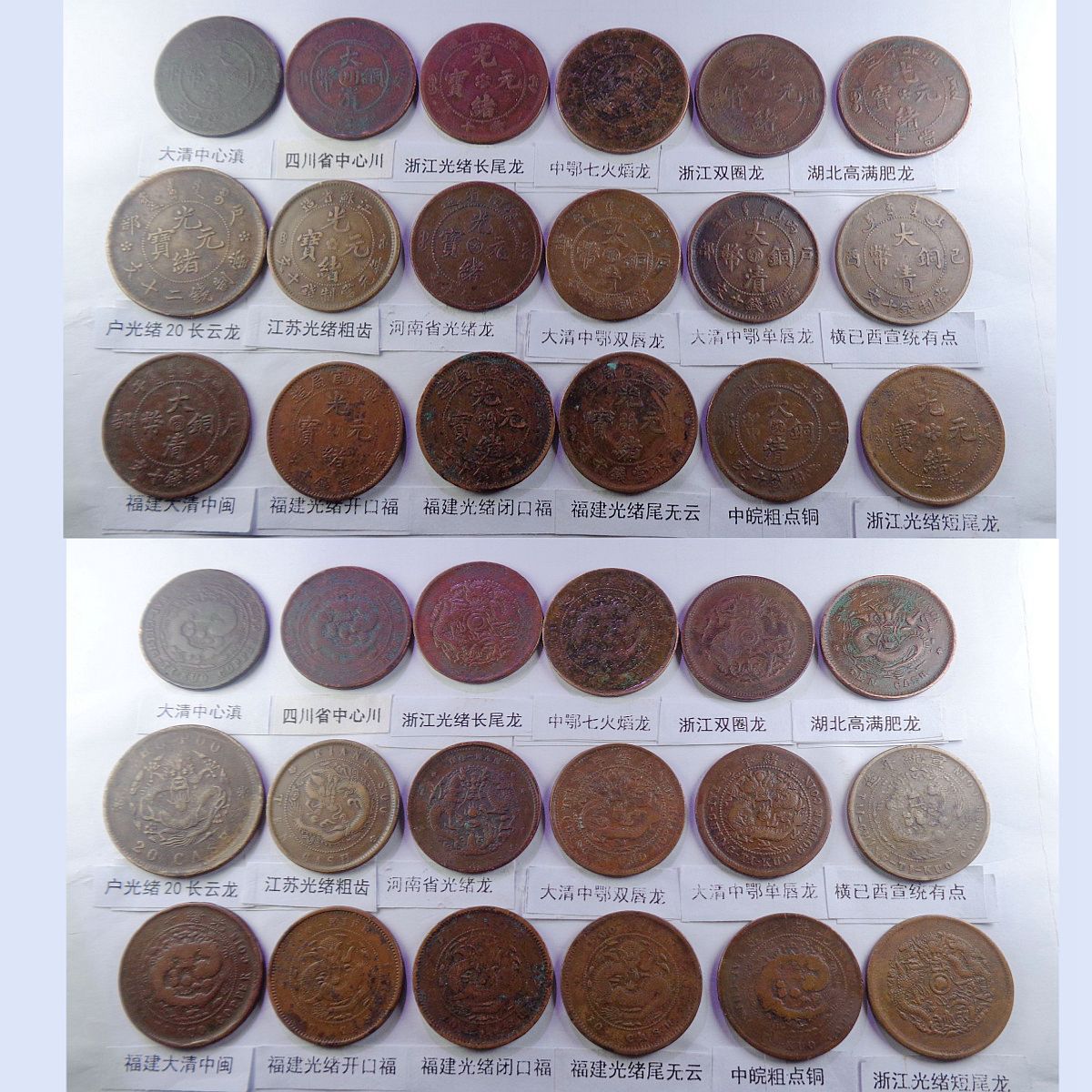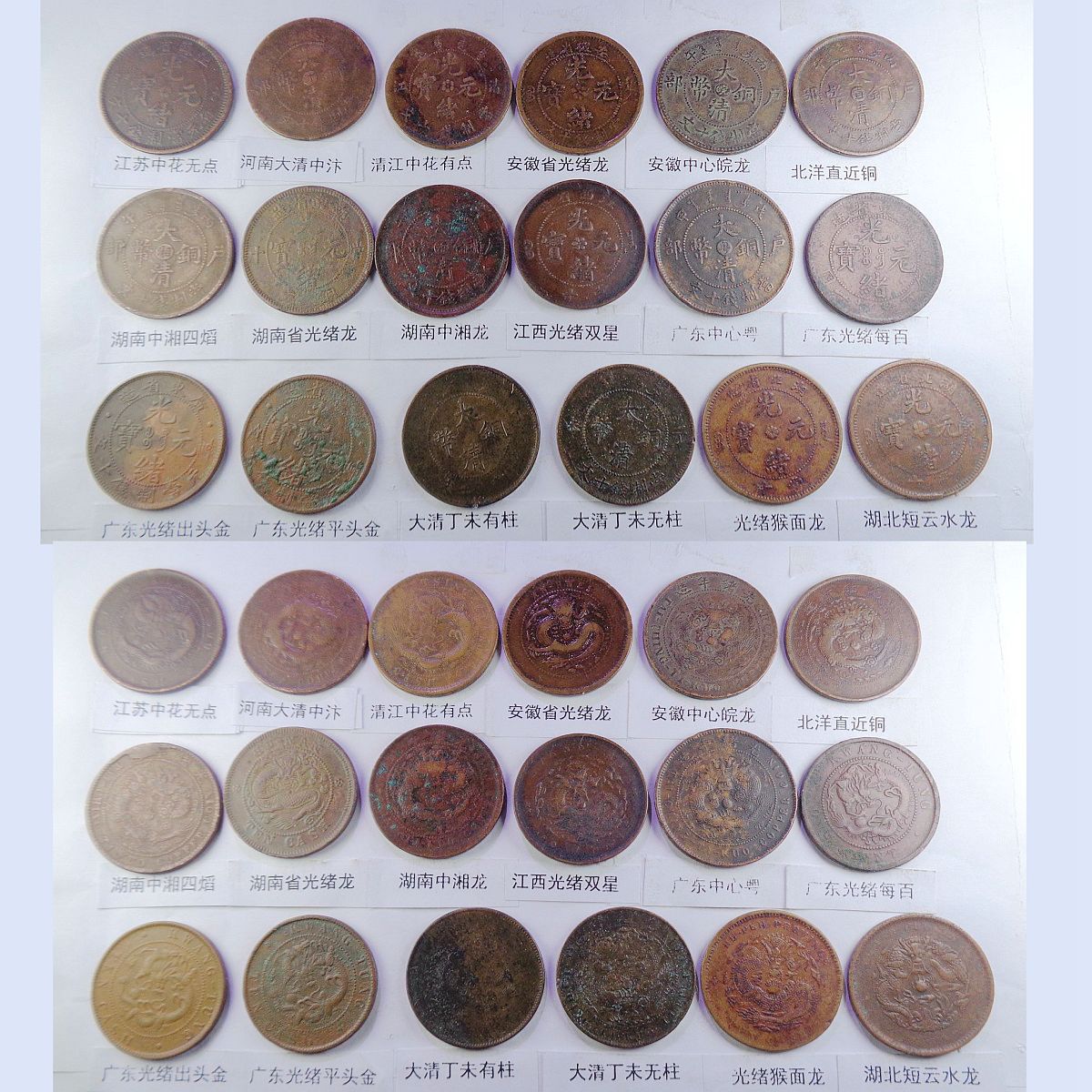 都是存世巧克力包浆和黑牡丹包浆。所售钱币终身包老包真。假*币包退赔。具体品种是: 江苏光绪龙 江苏光绪上乙已 江南光绪横乙已 江南横乙龙下点 大清双冠龙 湖北6路鳞龙 江南闭口甲辰 江南开口甲辰 大清横已酉宣统 大清上已酉宣统 北洋光绪龙 北洋直远铜 江南省单点癸 江南光绪壬寅 江南光绪上乙已 江南背长边花 湖北7路7刺龙 湖北7路9刺龙 江苏中花无点 河南大清中汴 清江中花有点 安徽光绪龙 安徽中心皖 北洋直近铜 湖南中湘四焰 湖南省光绪龙 湖南中湘龙 江西光绪双星 广东中心粤 广东光绪每百 广东光绪平头金 广东光绪出头金 大清丁未有柱 大清丁未无柱 光绪猴面龙 湖北短云水龙 大清中心滇 四川省中心川 浙江光绪长尾龙 中鄂七火焰龙 浙江双圈龙 湖北高满肥龙 户光绪20长云 江苏光绪粗齿 河南省光绪龙 大清中鄂双唇 大清中鄂单唇 横已酉宣统有点 福建大清中闽 福建光绪开口福 福建光绪闭口福 福建光绪尾无云 中皖粗点铜 浙江光绪短尾龙 中宁丁未四牙龙 江西光绪单星 戊申高冠弯月龙 湖北水龙低剌 湖北水龙高剌 湖北低满肥龙 已酉宣统二十文 大清丁未二十文 户部光绪二十文 已酉宣统缺笔已 江南省双点癸 浙江中心浙 丙午阴宁水龙 大清无台阳宁 湖南双旗扁菊花 湖南双旗五角星 山西壹枚园缨币 河南双旗二十文 开国纪念空心圈 河南双旗十文 开国纪念大吊樱 开国纪念实心圈 广东省一仙铜币 民国党微一分 湖南禾花十文 开国纪念连叶 。