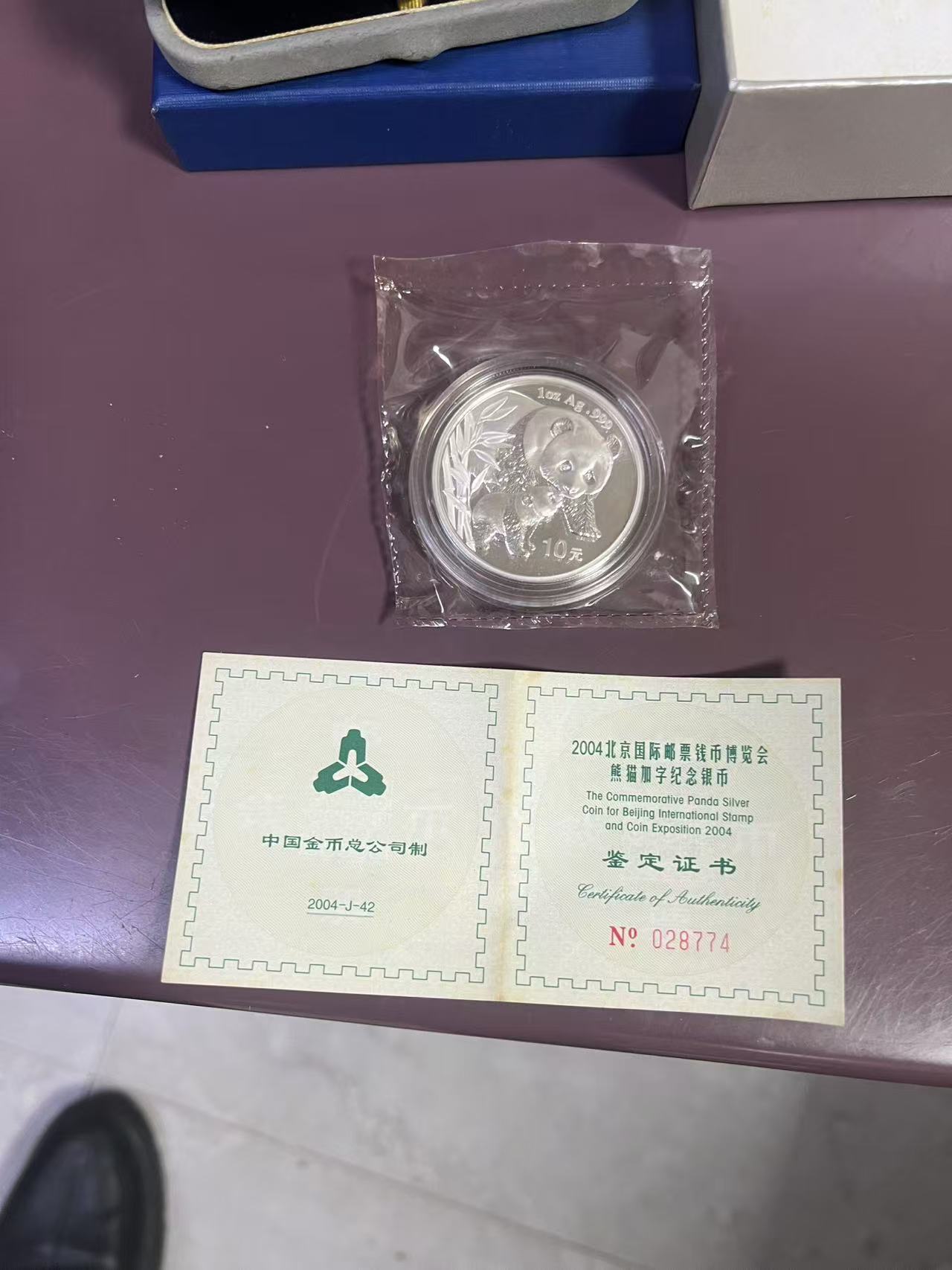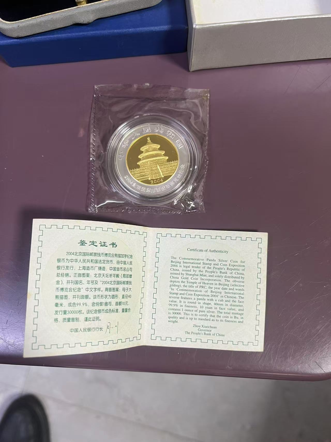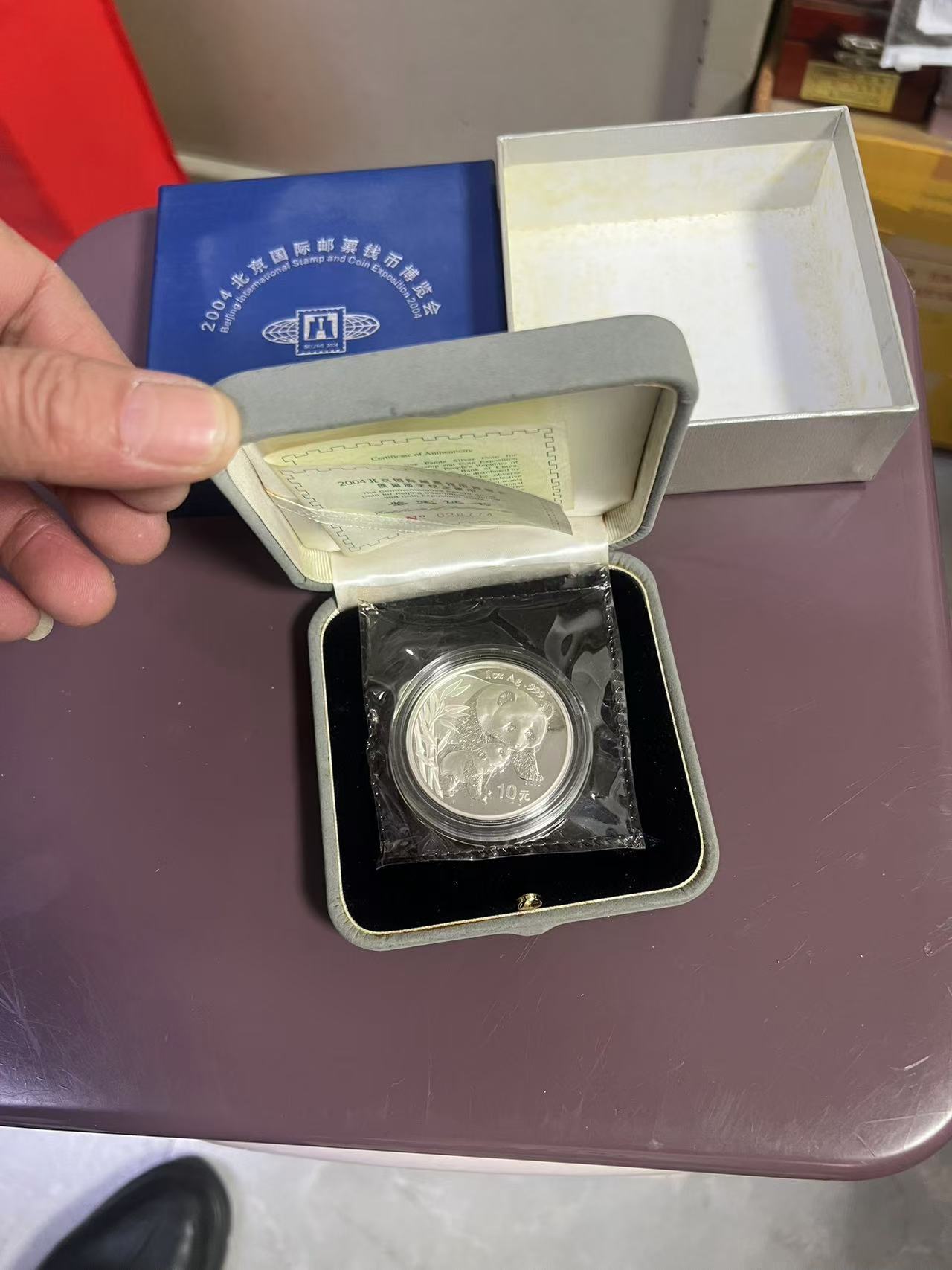 2004北京国际邮票钱币博览会熊猫加字纪念银币,证盒齐全,品相漂亮,售760元,款到包到手。