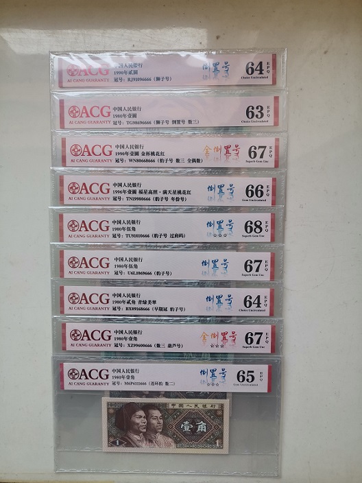 双豹子倒置号2枚(805,8001三冠);大司令倒置豹子号1枚(802)。由此可见,本套币不仅集各种倒置号精品之大成,而且均已经过爱藏严评,真假无忧,品相透明。另附精美珍藏册和手提袋,从号码币的角度来说,应该说这就是一件顶级藏品了,目前来看全网唯一。本人关注倒置号多年,其间不断的多网搜索,至今未发现全品相的80100和8050尾号666的倒置豹子号,80100只见到本套中的这一张,8050也只见到3张(包括本套中的一张),而且都是中等偏下的流通品,实在是太稀缺了。注:1角和5角共4张为赠品,分别为ACG68E和67E(8005);ACG67E和65E(8001)。售价35000元,需要的私聊。