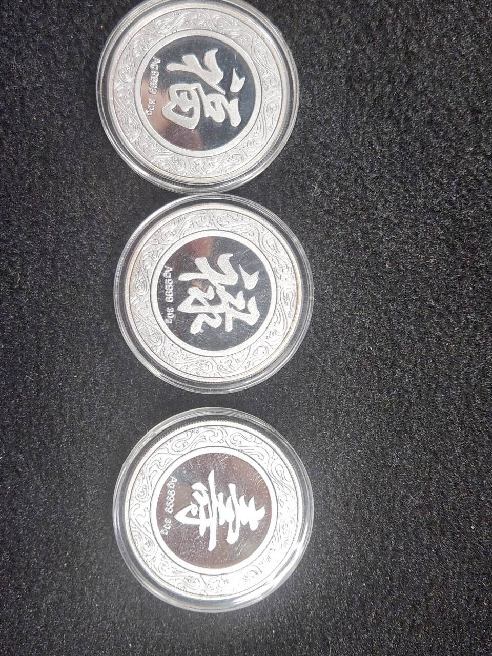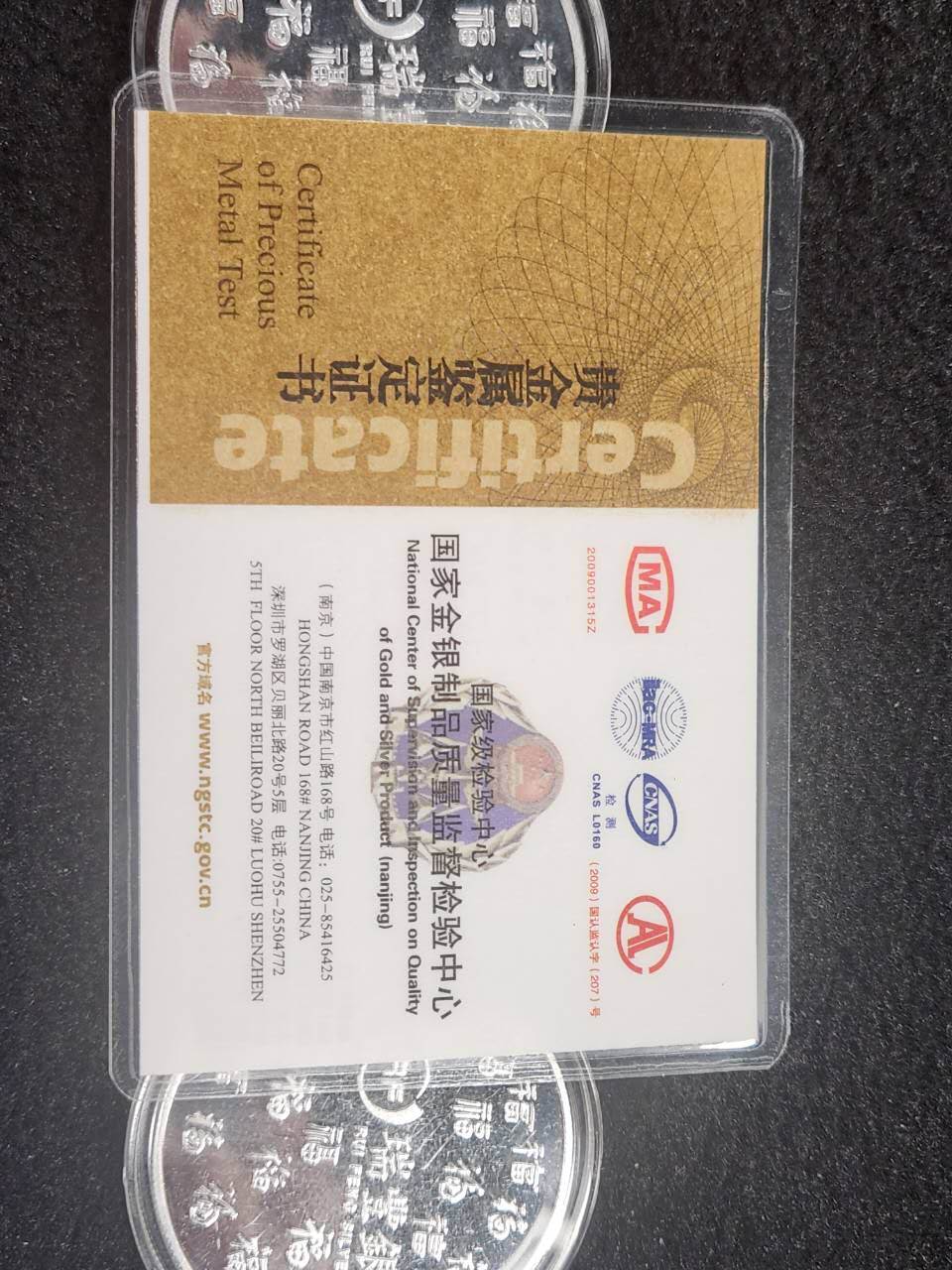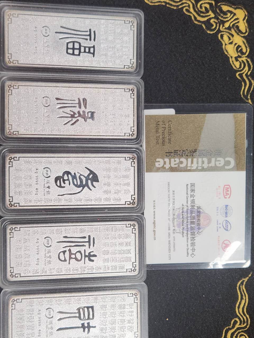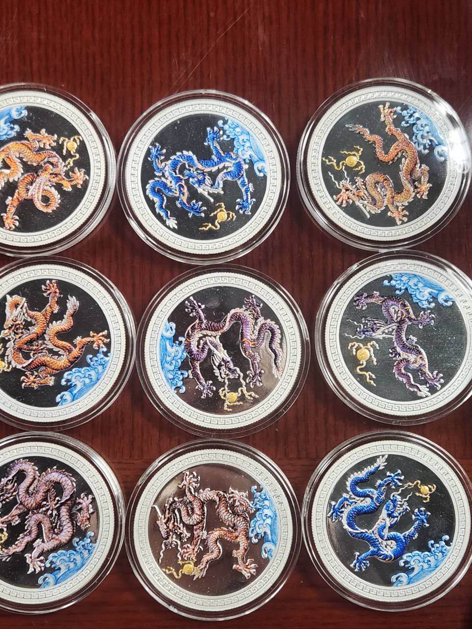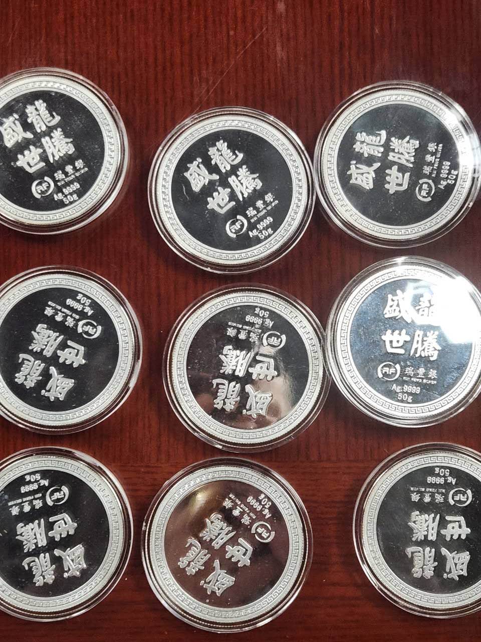 九腾盛世九龙币,纯银9999,带鉴定证书,每枚50克,共计九枚,原盒加微信见图,克价19。纯银9999福禄壽,克重30g,带证书,每枚克价19元。五福纯银9999彩条,原盒带证书,每`枚重40g售价每克19.加微信确认。