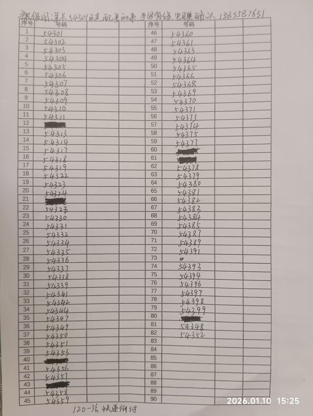 配号的来,120一张倒付,手写有误,电联确认