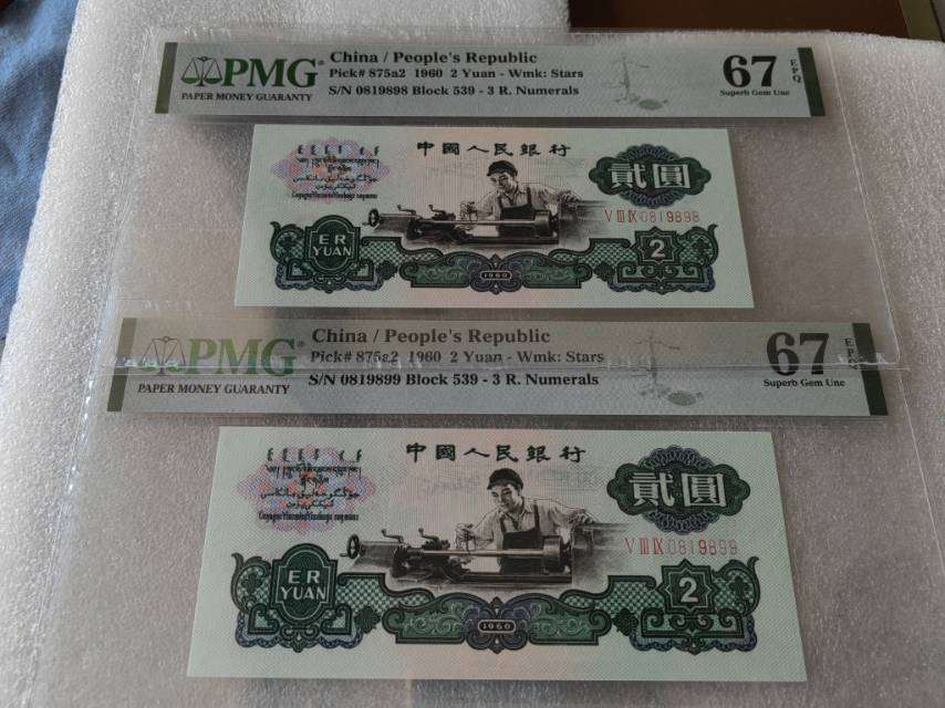 → 三版币的精品车工,PMG67分,精品倒置号,0819898,0819899,2张连号,大靓号!尺足,无斑,状态完美,2张一起出,22800包顺丰