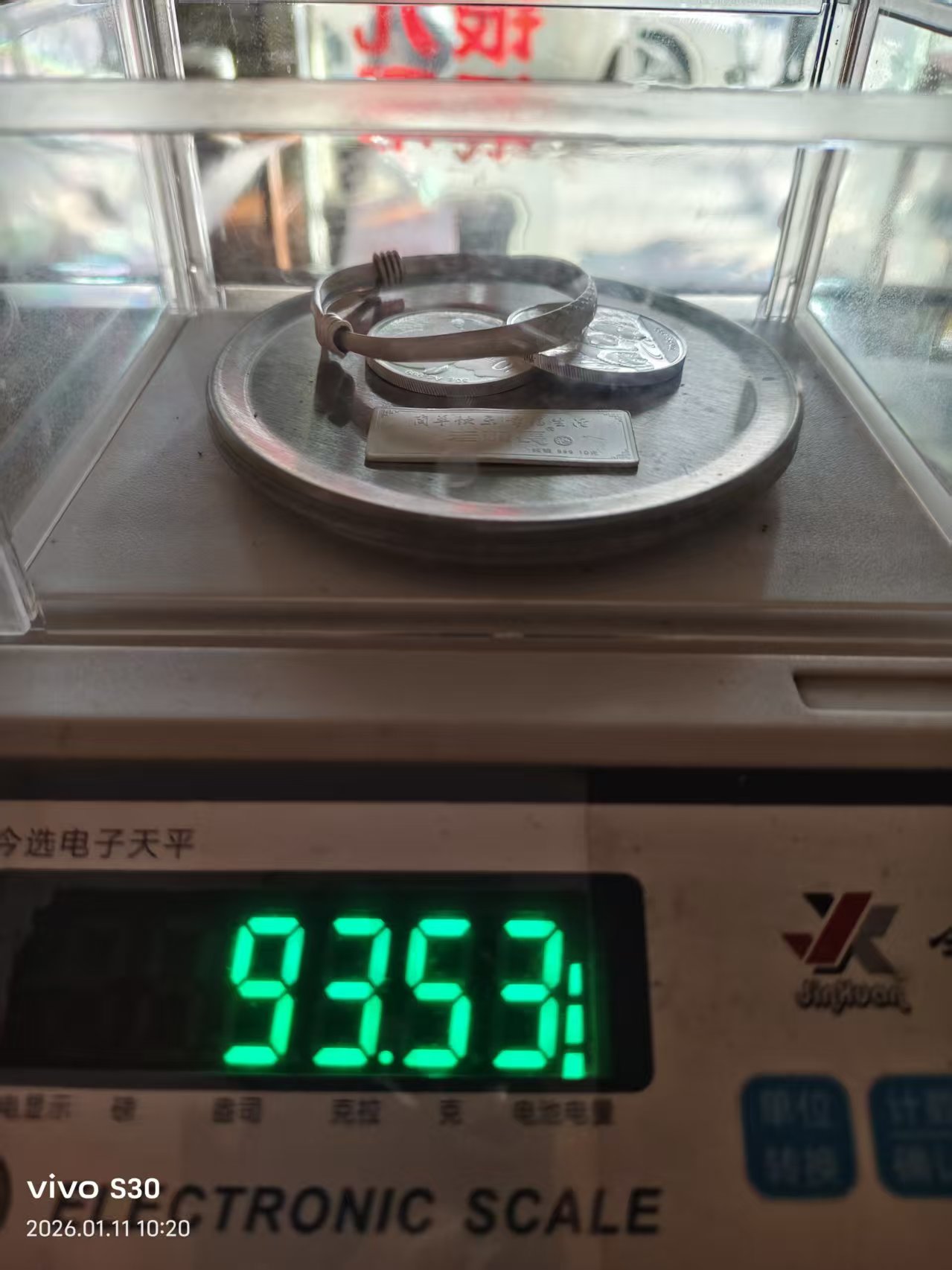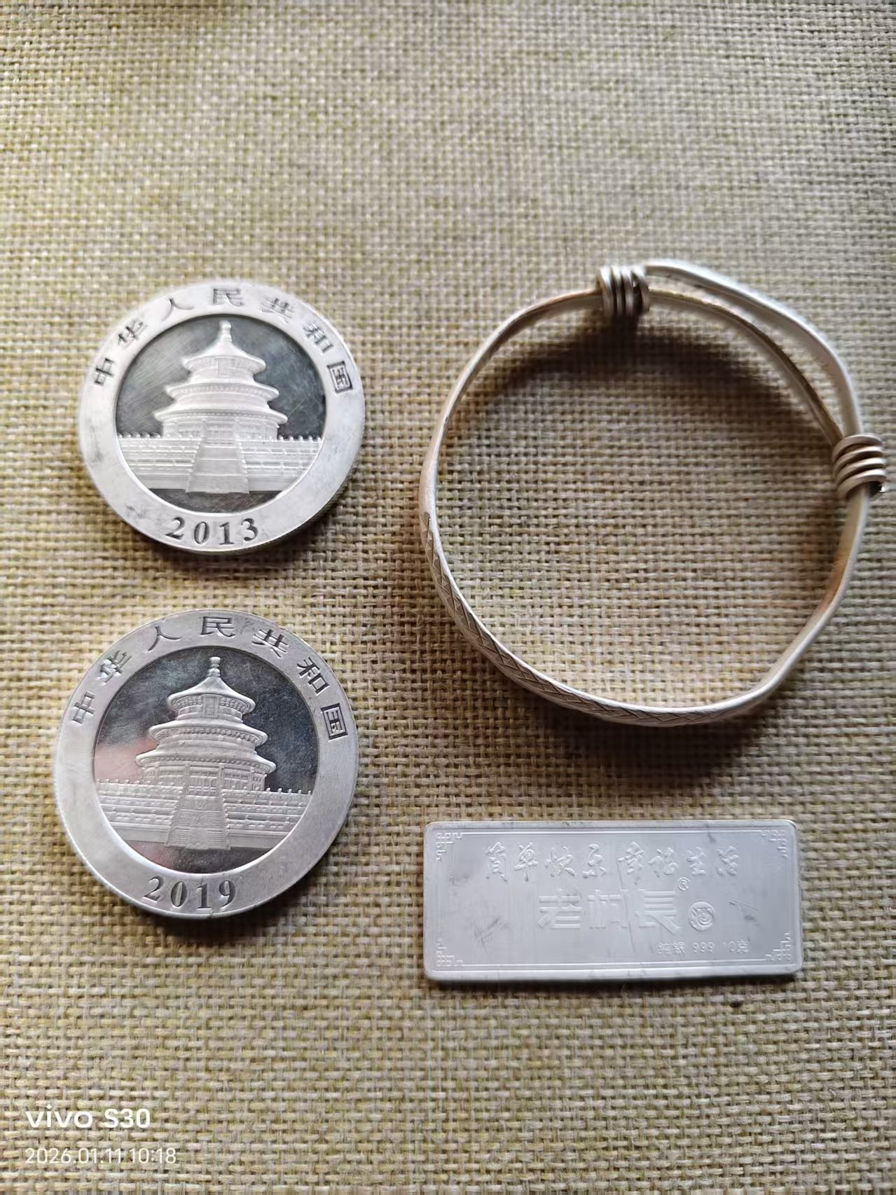 银价出猫币二枚和银章加足银手镯,都过了火,19.7*93.53==1842