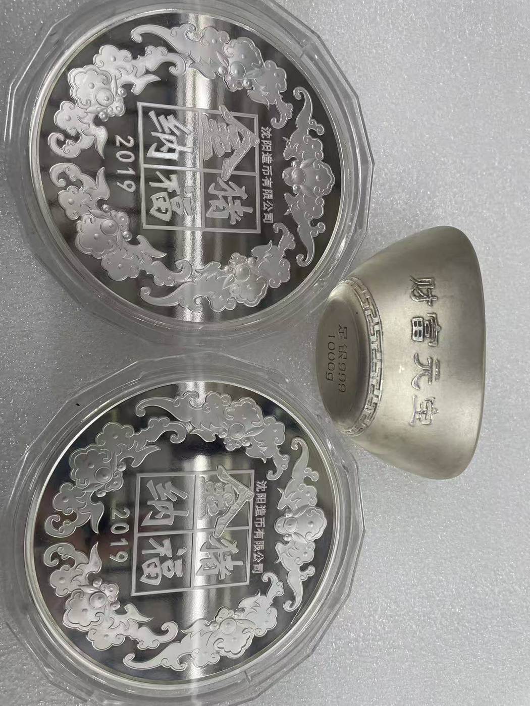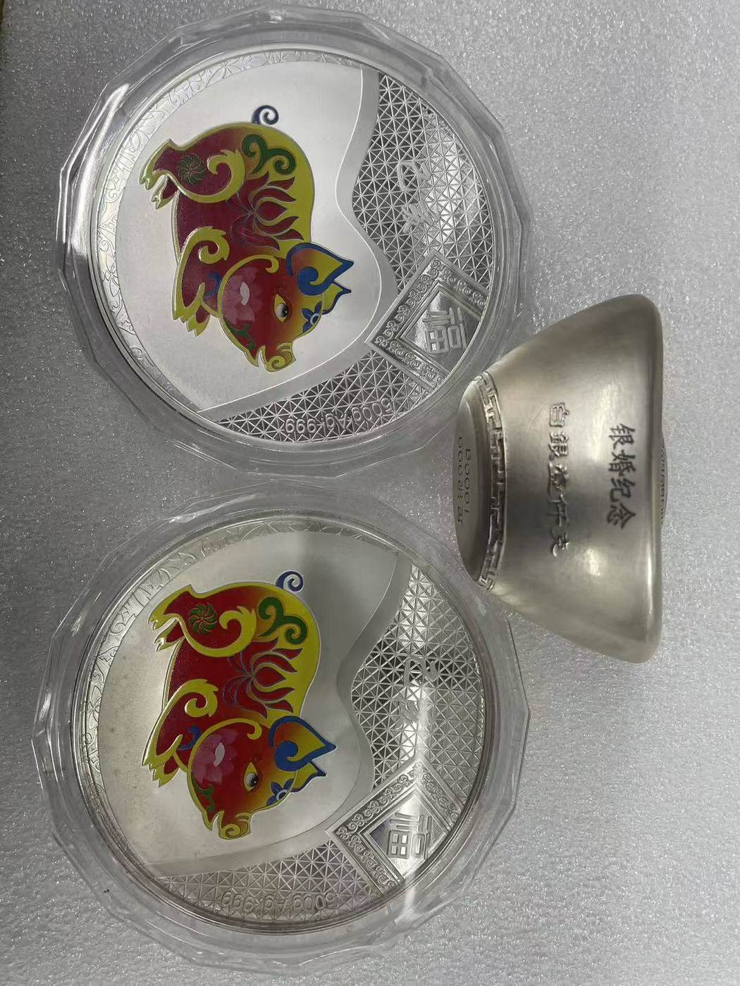 → 售沈币厂银猪章1000克和银元宝1000 克