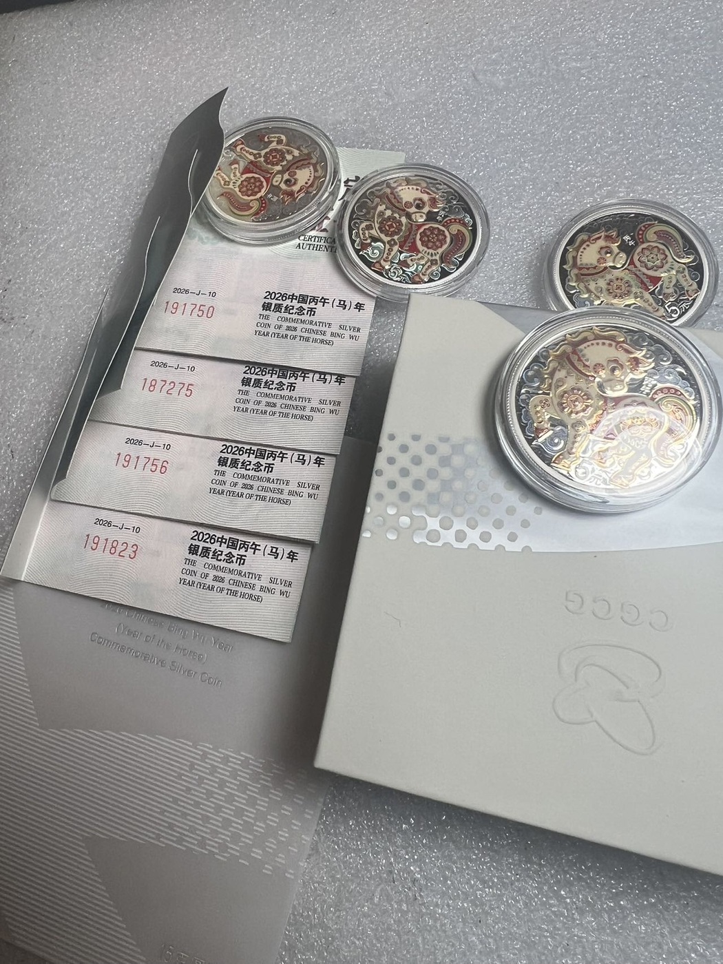 → 610一枚出售4枚26年15克彩银马,一起出包邮。号码无4,无47