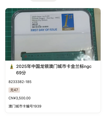 → 包邮2025中国龙银币澳门城市卡NGC金兰MS69分