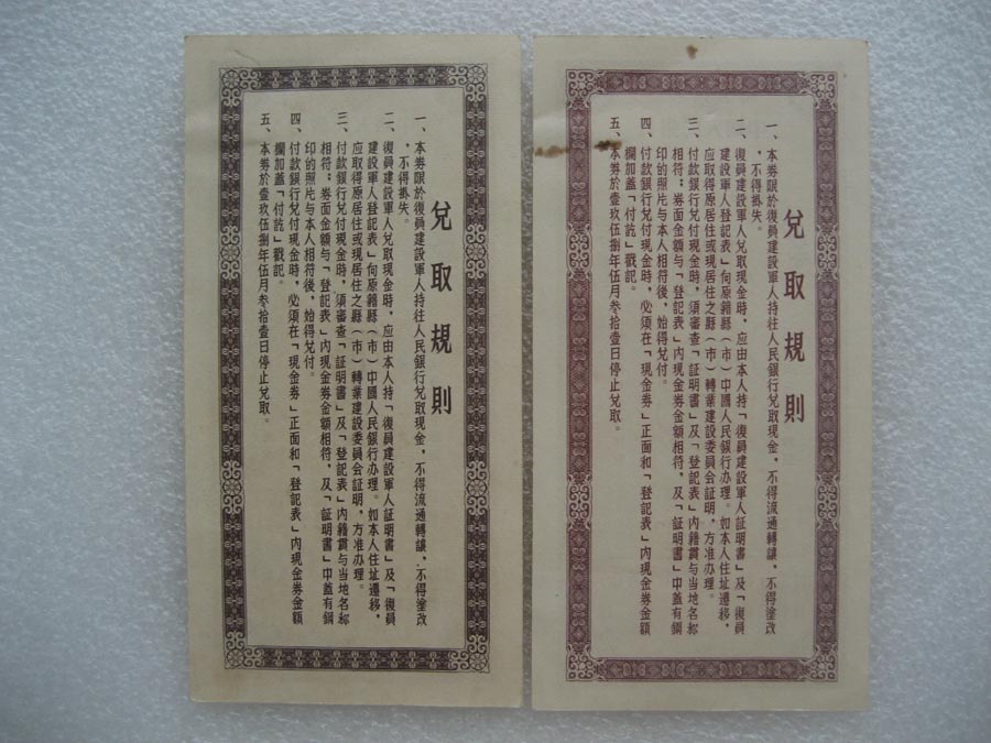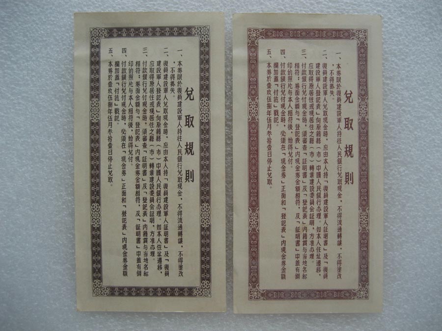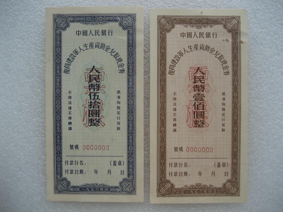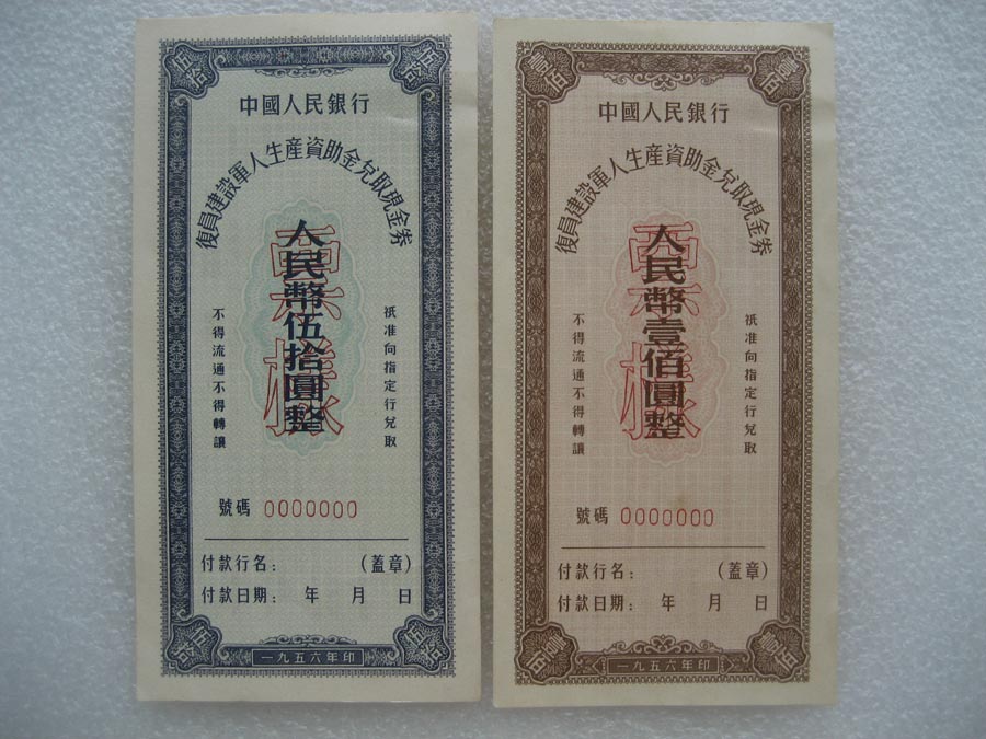 → 1956年中国人民银行复员建设军人生产资助金兑换现金券 伍拾圆、壹佰圆票样 两套