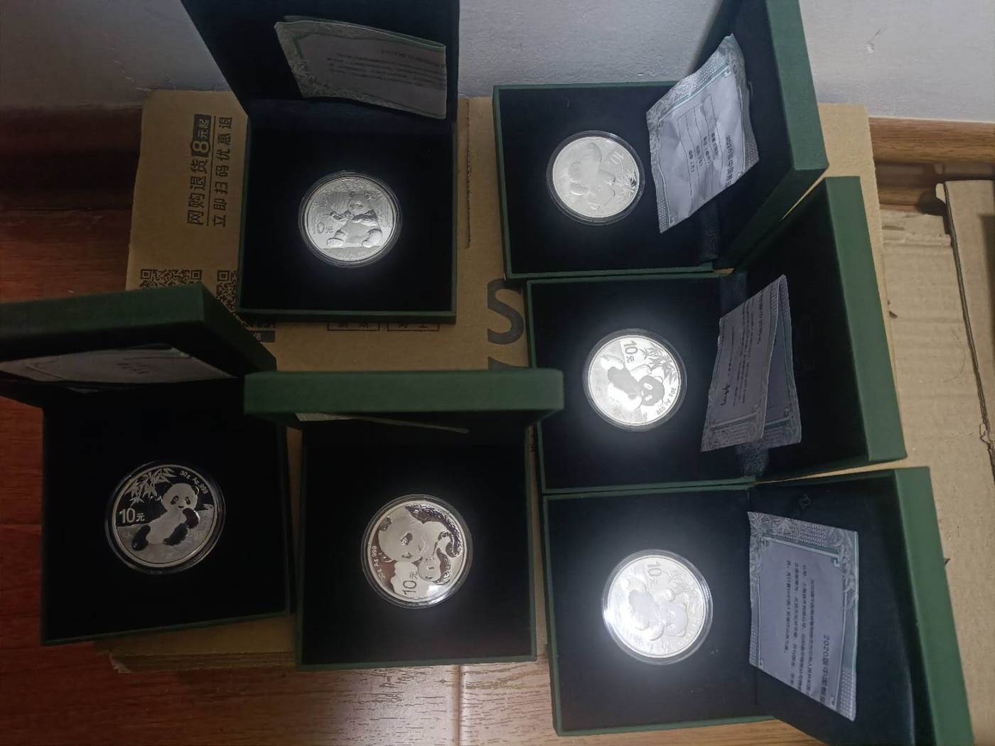出熊猫银币6个有盒子带证书,20年4个,17年1个,19年1个,以上6个一起出650ⅹ6=3900包邮,有需要加微信A15200508211