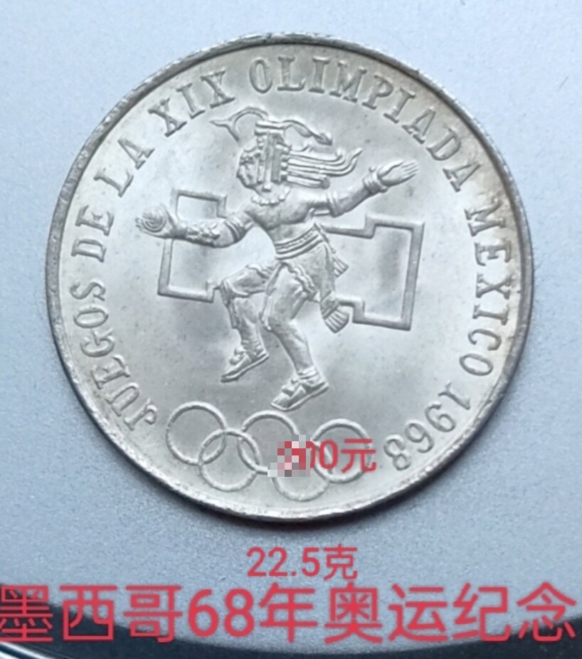1968年墨西哥奥运会25比索,正面人和五环.背面鹰叼蛇和面值.重22.5克,72银,2枚,320元。可以微信看细图,低于银价了