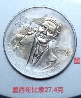 墨西哥100比索.正面英雄人像.背面鹰叼蛇,重27.4克,3枚,1977-1979年各1枚,320元。