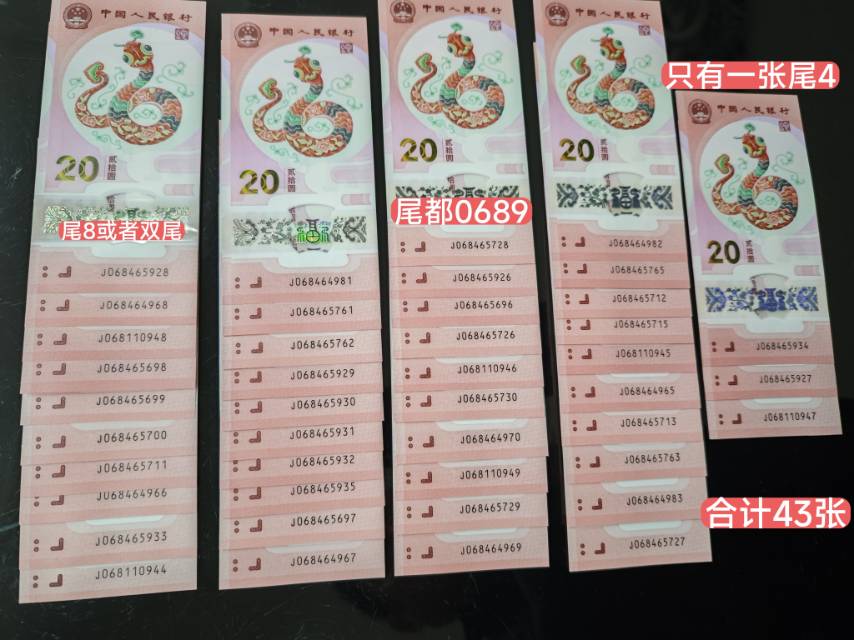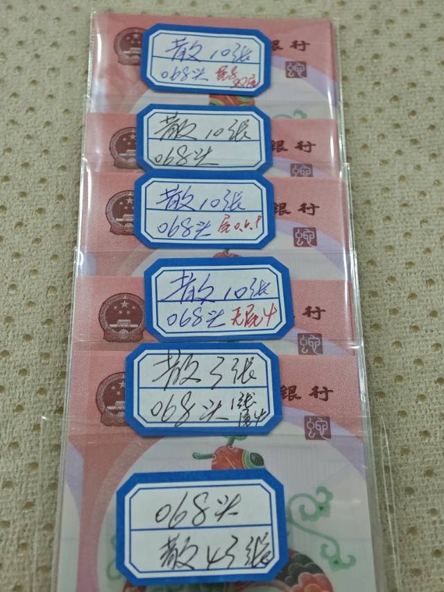 去年领的原封未流通,江苏号段068头,只有一张尾4,其余都是尾8、尾6、尾9、尾0、双尾等等