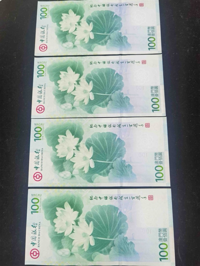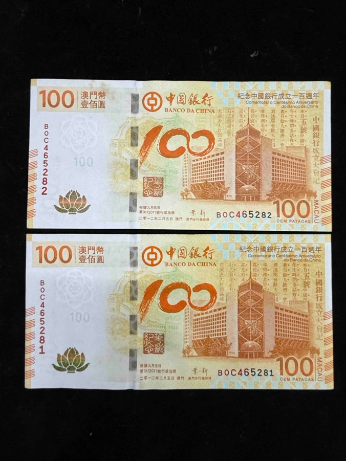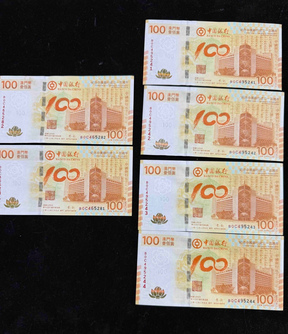 中国银行成立一百周年澳门纪念钞,带原装保护册,其中一张左边帶黃班(BOC465282如图所示),其它品相良好實物如图,两张順号和四张顺号,一共六张。